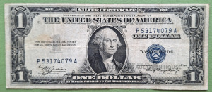 | Nosaukums | 1935. gada А sērijas 1 dolāra sudraba sertifikāts. Īpašības: To raksturo zils valsts kases zīmogs un sērijas numuri, kā arī uzraksts “apmaināms pret |