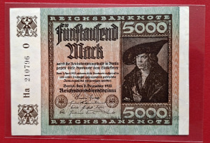 | Nosaukums | Vācijas 5000 marku banknote no 1922. gada. Vācija (Veimāras Republika). Izlaiduma datums: 1922. gada 2. decembris. Attēls: Albrehta Dīrera gleznotais |