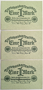 | Nosaukums | Trīs vācu 1 markas banknotes, izlaistas 1922. gada 15. septembrī. Kolekcionējama papīra nauda (banknotes) no Veimāras Republikas. |