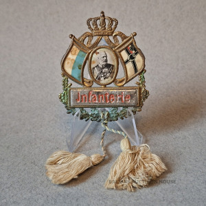 Kolekcionējama militārā nozīmīte vai piemiņas medaļa, kas, visticamāk, saistīta ar Vācijas impērijas kājniekiem. Dizains: Nozīmīte ir ģerboņa formā ar kroni augšpusē, ko ierāmē ozola lapas. Centrālais elements: Monarha, ķeizara Vilhelma II, attēls aplī, ko ieskauj karogi. Uz nozīmītes ir uzraksts "Kājnieki". Sīkāka informācija: Pie nozīmītes ir piestiprinātas dekoratīvas aukliņas ar pušķiem. . Izmērs: 6,5 cm - 4,5 cm. Stāvoklis: Skatīt fotoattēlu.