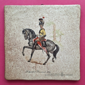 Dekoratīva flīze, kas attēlo jātnieku gvardi, datēta ar 1828. gadu. Karaliskās Dānijas zirgu gvardes (Kongelig Hestgarde) jātnieka attēls.