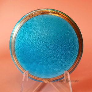Antīka sudraba pūdera kompakte ar zilu giloša emalju, ap 1910. gadu. F&B 925. Foster & Bailey. Svars 50 grami. Diametrs 5 cm.