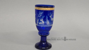 Egermann stila kobaltzils krāsainā stikla biķeris .H 18 cm.Attēlā redzams skats mežā ar briežiem (vai stirnām) un kokiem klasisks medību motīvs,(medību tematika).