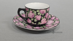 Porcelāna kafijas komplekts.Tasei un apakštasei ir ļoti krāšņs, blīvs rožu motīvs uz melna fona. Šis stils dažreiz tiek dēvēts par "Chintz" stilu, kas bija ļoti populārs Eiropas porcelāna mākslā, lai imitētu apdrukātus audumus. Art Deco ēras beigas vai pēckara vintage stils Holande J.G. van Agt (J.G. Az. H.). Šāds dizains un zīmogs raksturīgs 20. gadsimta vidus. Unikāls mākslas darbs.