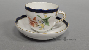 Porcelāna kafijas komplekts. "Meissen Flower" (Meisenes ziedu) stils ar rokām apgleznotiem botāniskiem motīviem. Zilā apmale ar zelta līniju "Kobaltblau" (kobaltzilo). Pasaules līmeņa klasika – Meisenes (Meissen) porcelāns, Vācija.
