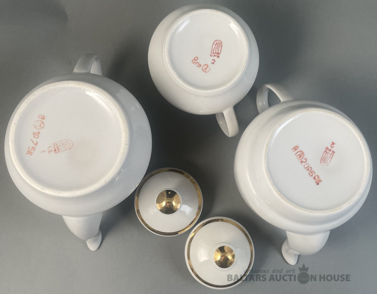 Tējas/kafijas servīze, porcelāns, zeltījums, dekols, Rīga. Kafijas kanna, tējkanna, krējuma trauks, 2 tējas krūzītes, 8 kafijas krūzītes, 13 apakštases, 4 bļodiņas, 6 tortes šķīvīši, Titula foto redzamās 2 apakštašu maliņas...šīs 2 apakštases atrodamas lotē 1256.