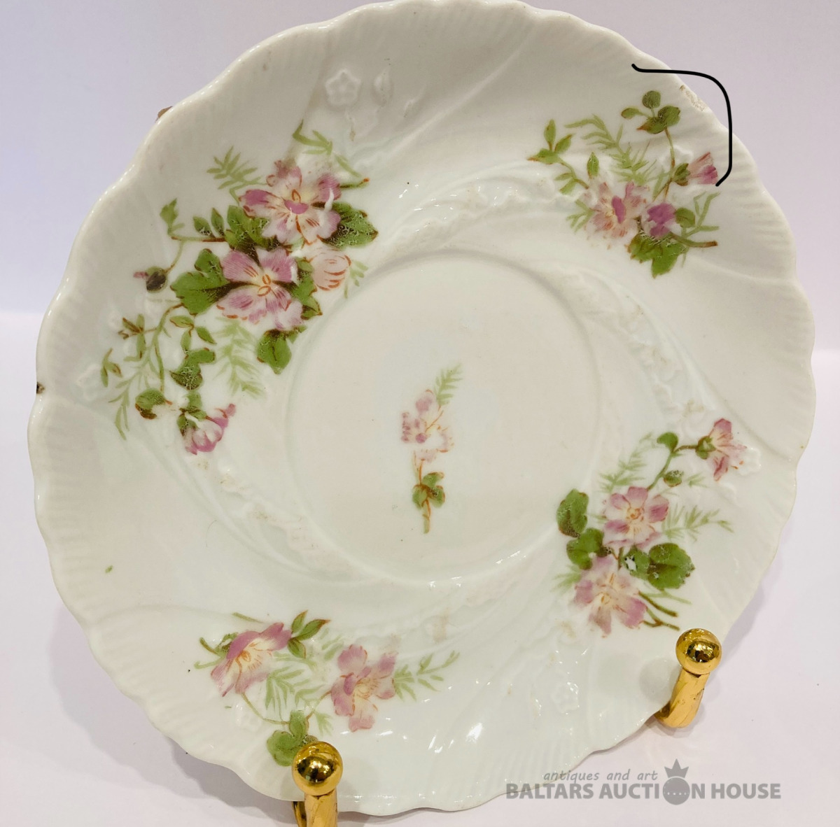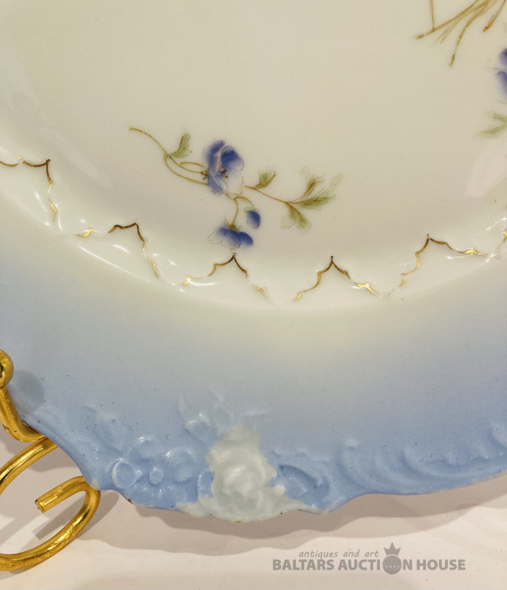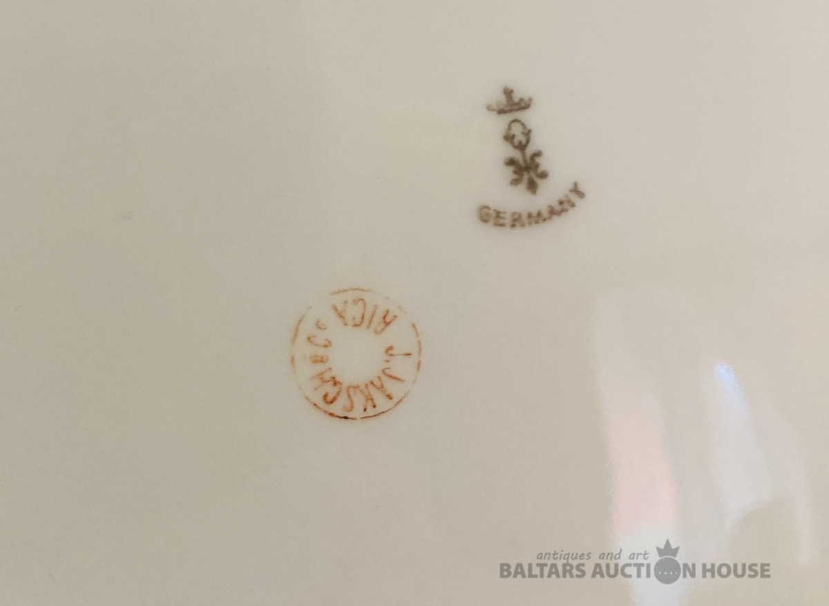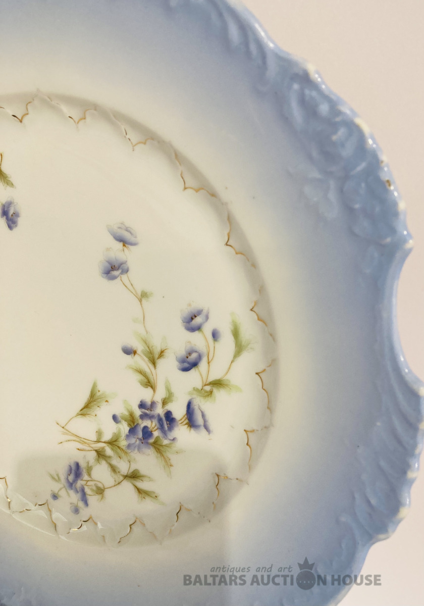 Jaksch & Co pirmskara perioda šķīvis, D-25 cm, reljefa malas, daļējs rokas sīkziedu apglenojums, vienā vietā ražošanas krāsojuma nepilnība, bez robiem un plaisām.