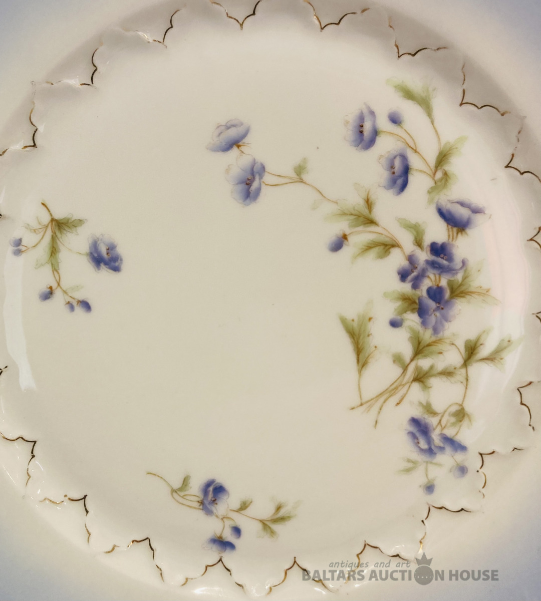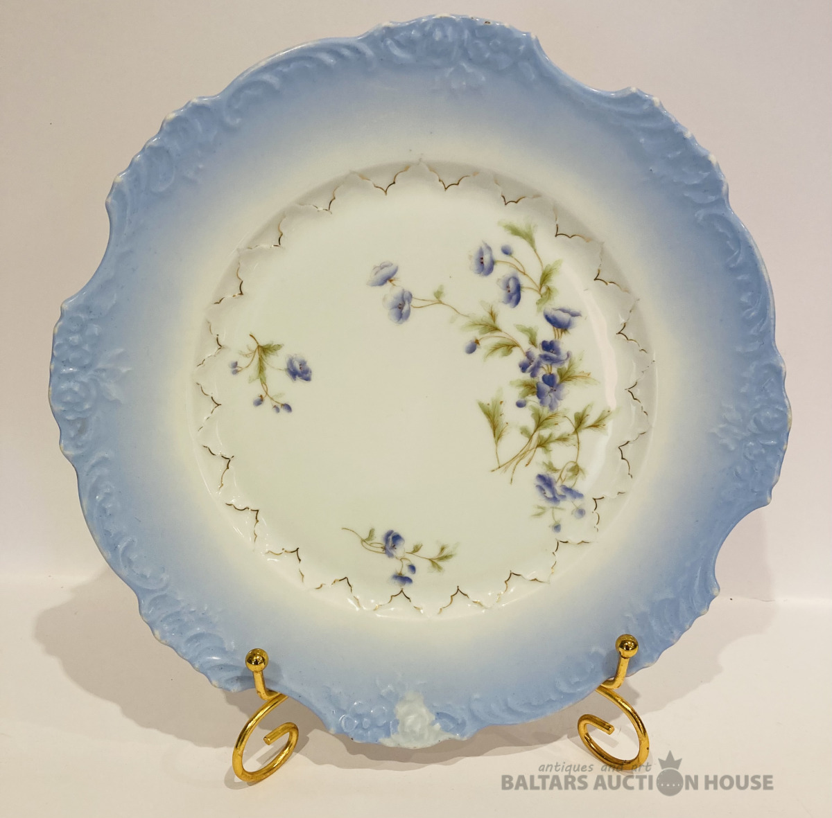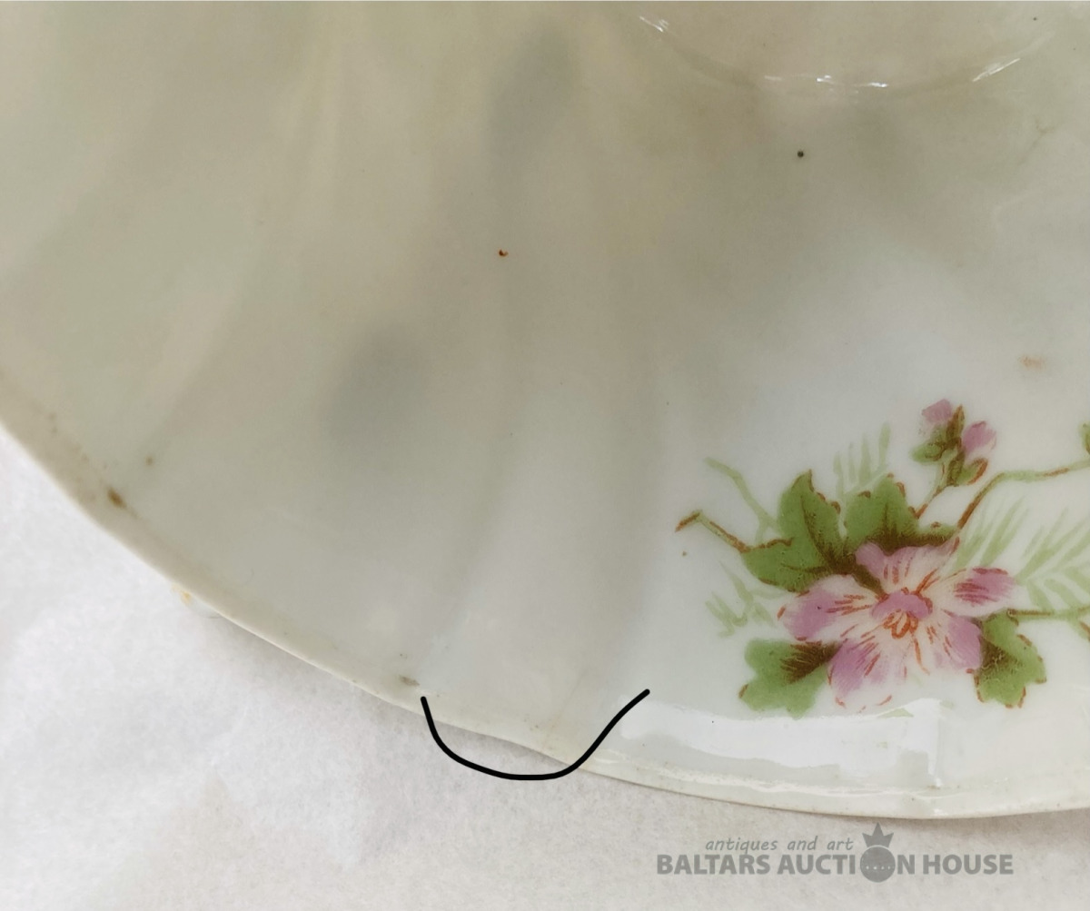 Jaksch & Co pirmskara perioda šķīvis, D-25 cm, reljefa malas, daļējs rokas sīkziedu apglenojums, vienā vietā ražošanas krāsojuma nepilnība, bez robiem un plaisām.