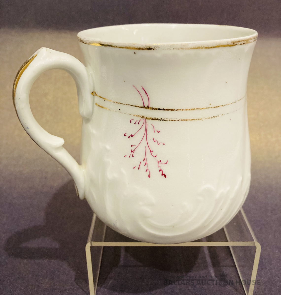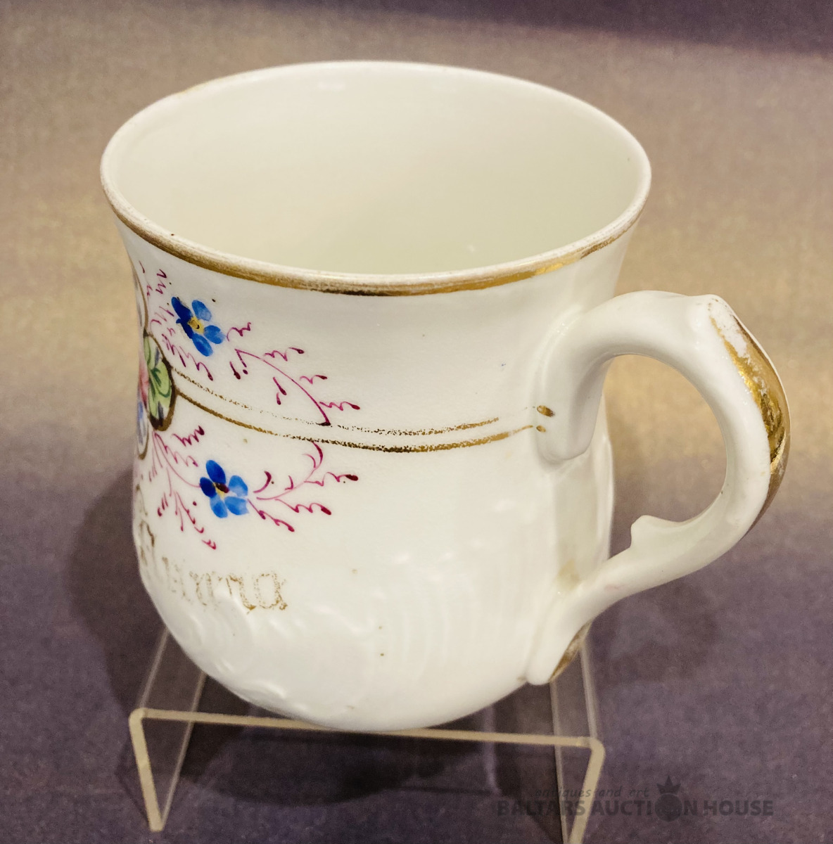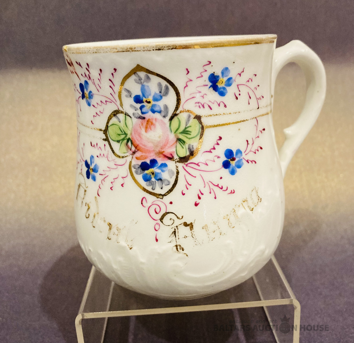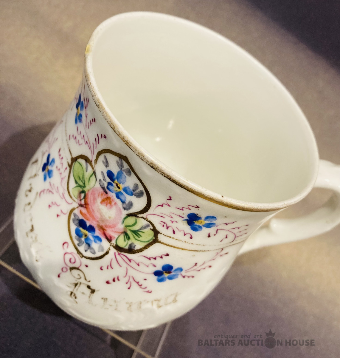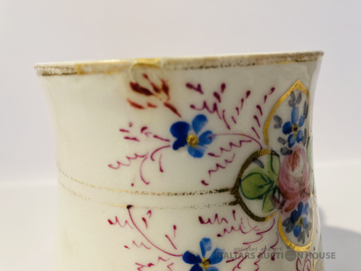 Kuzņecova liela krūze 400 ml ''Denj Angela'', 1890-1917, rokas apgleznojums, vietām viegls zelta dilums, uz maliņas mini sena restaurācija (sk.foto), bez robiem un plaisām.
