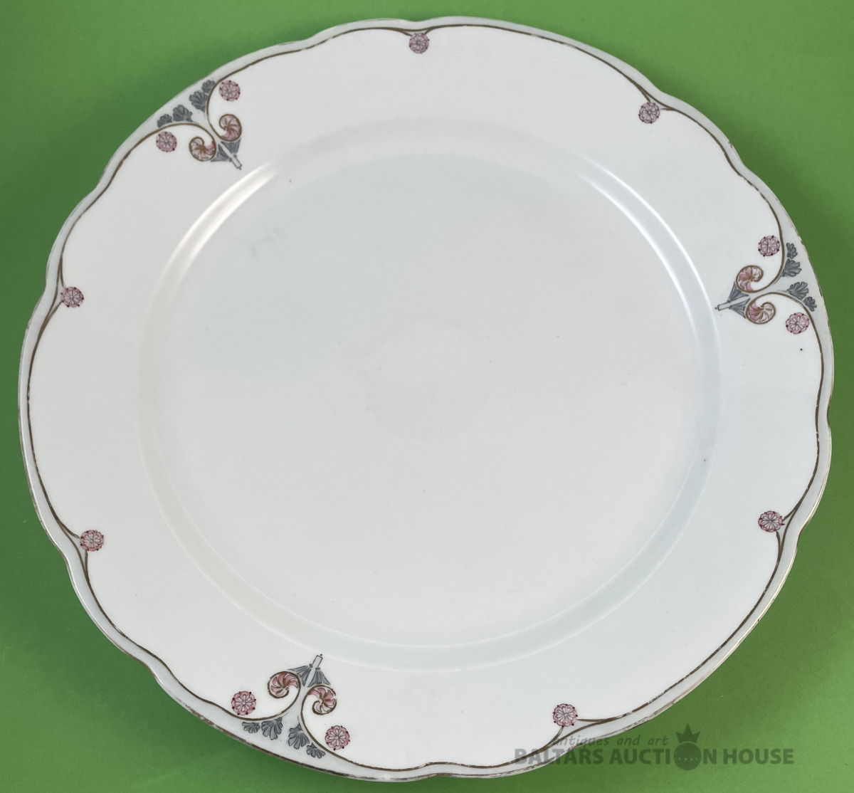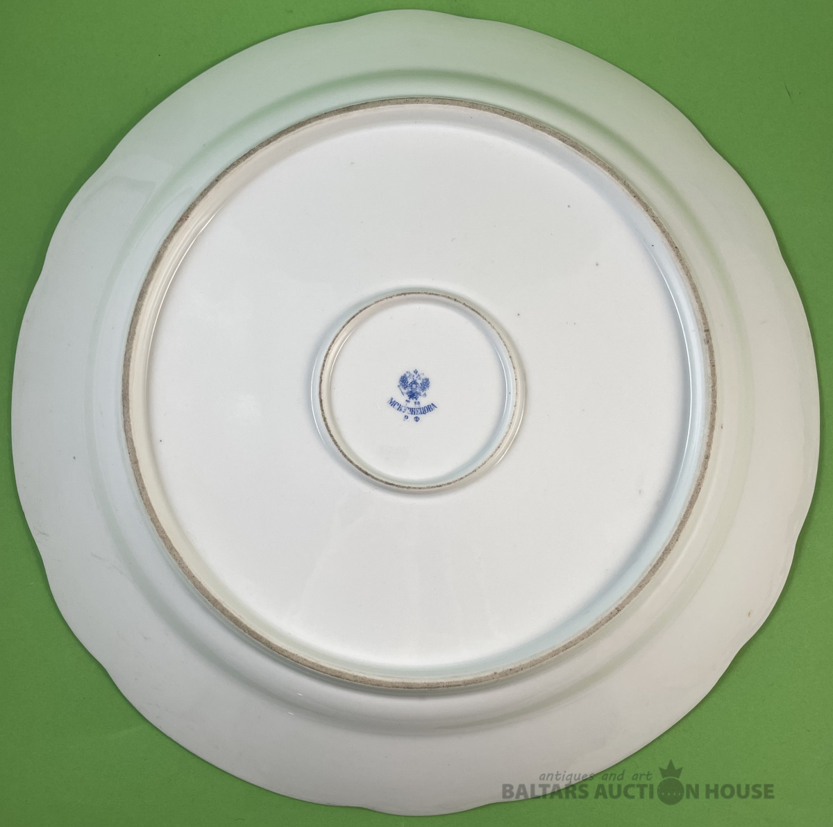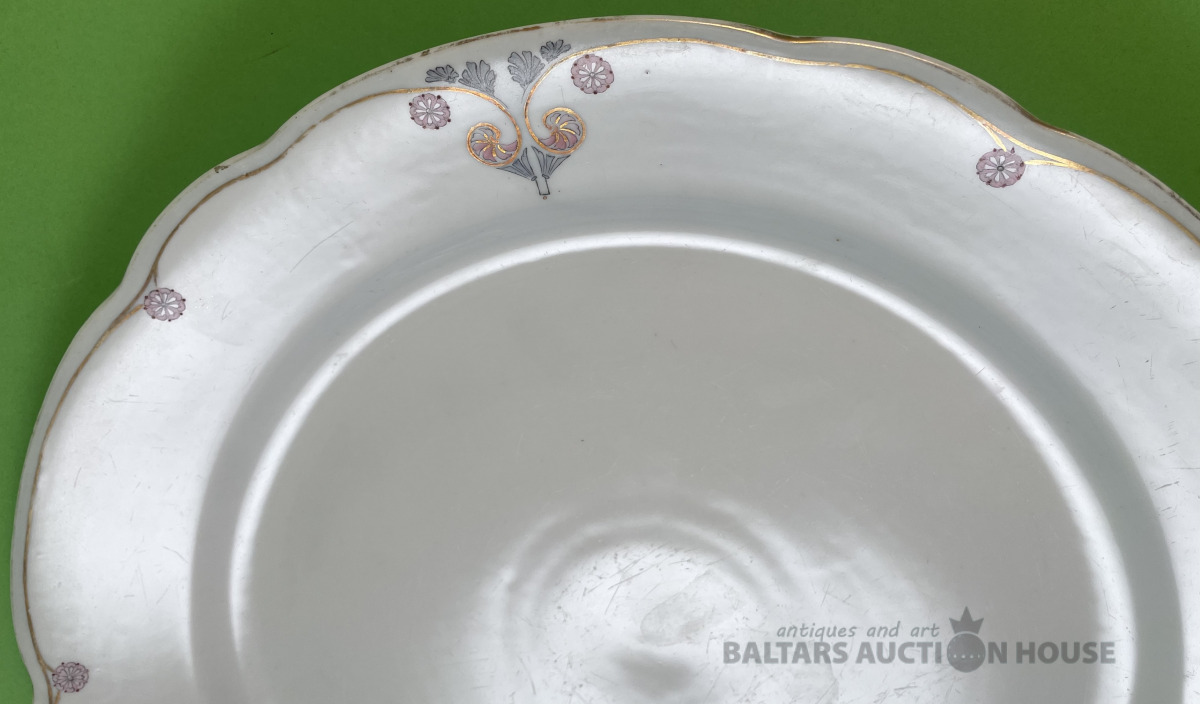 Liels šķīvis uzkodām, JUGENDSTILS, porcelāns, zeltījums, Kuzņecova f-ka Rīgā, d=36 cm, dabīgs krāsas nodilums