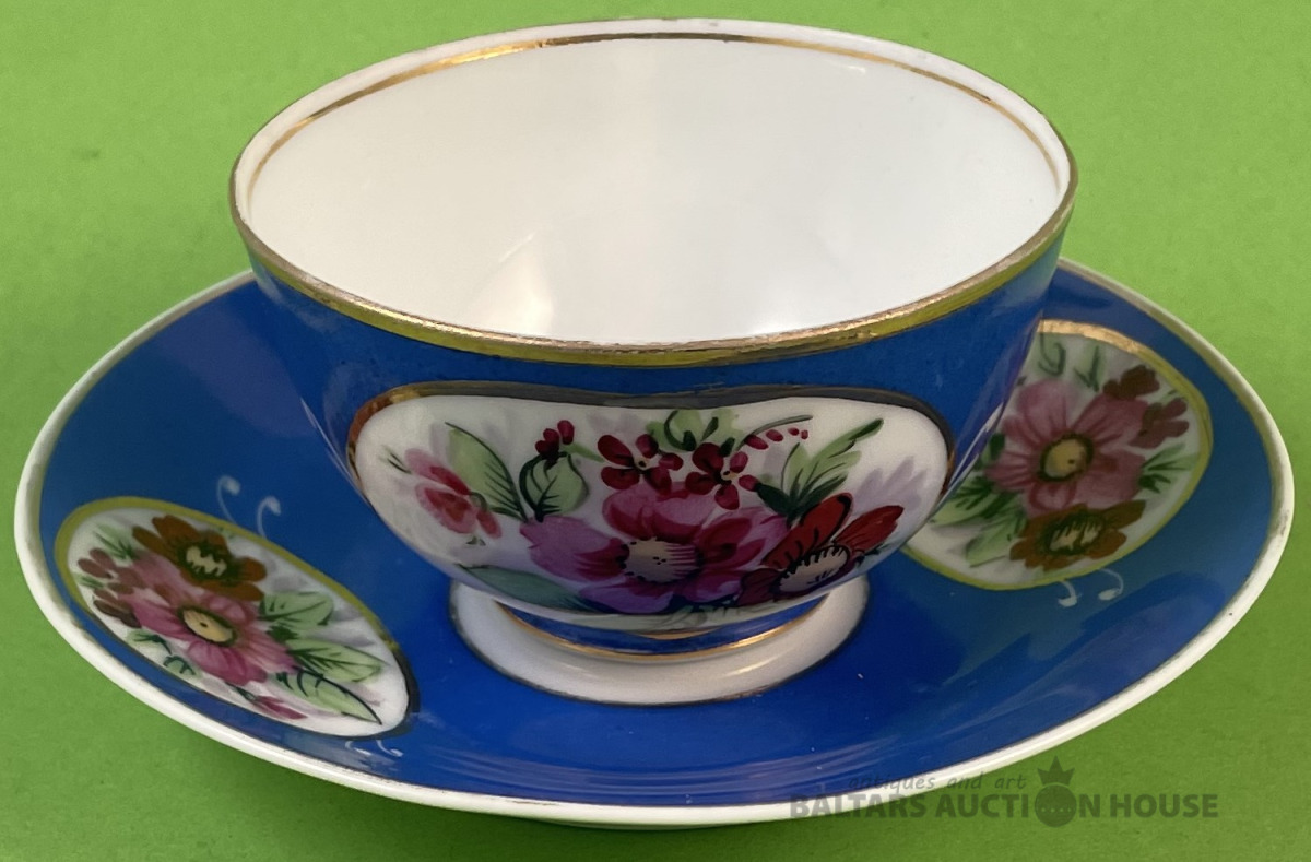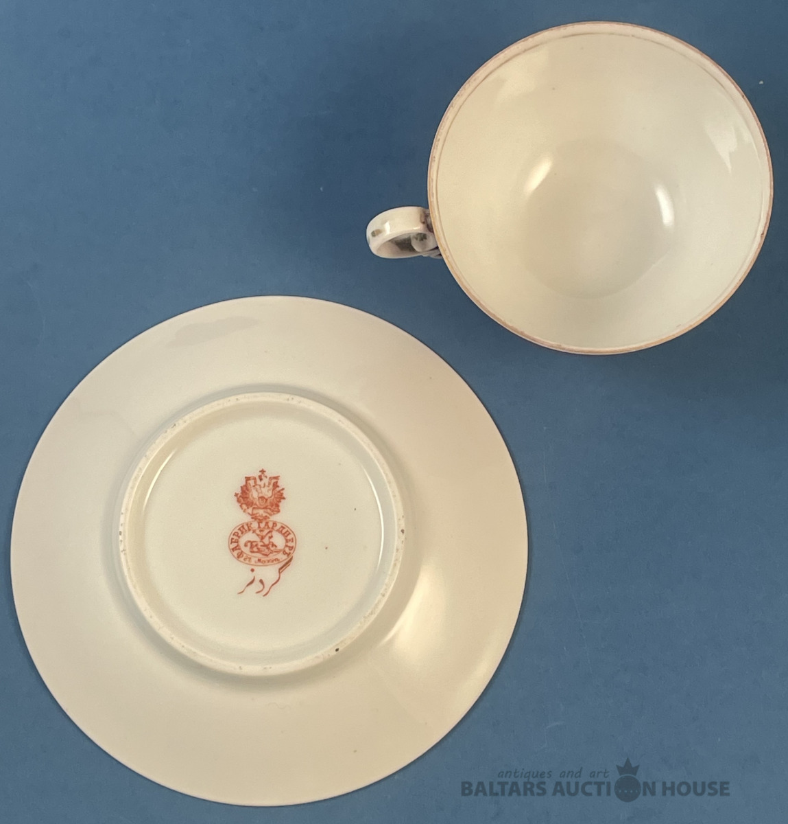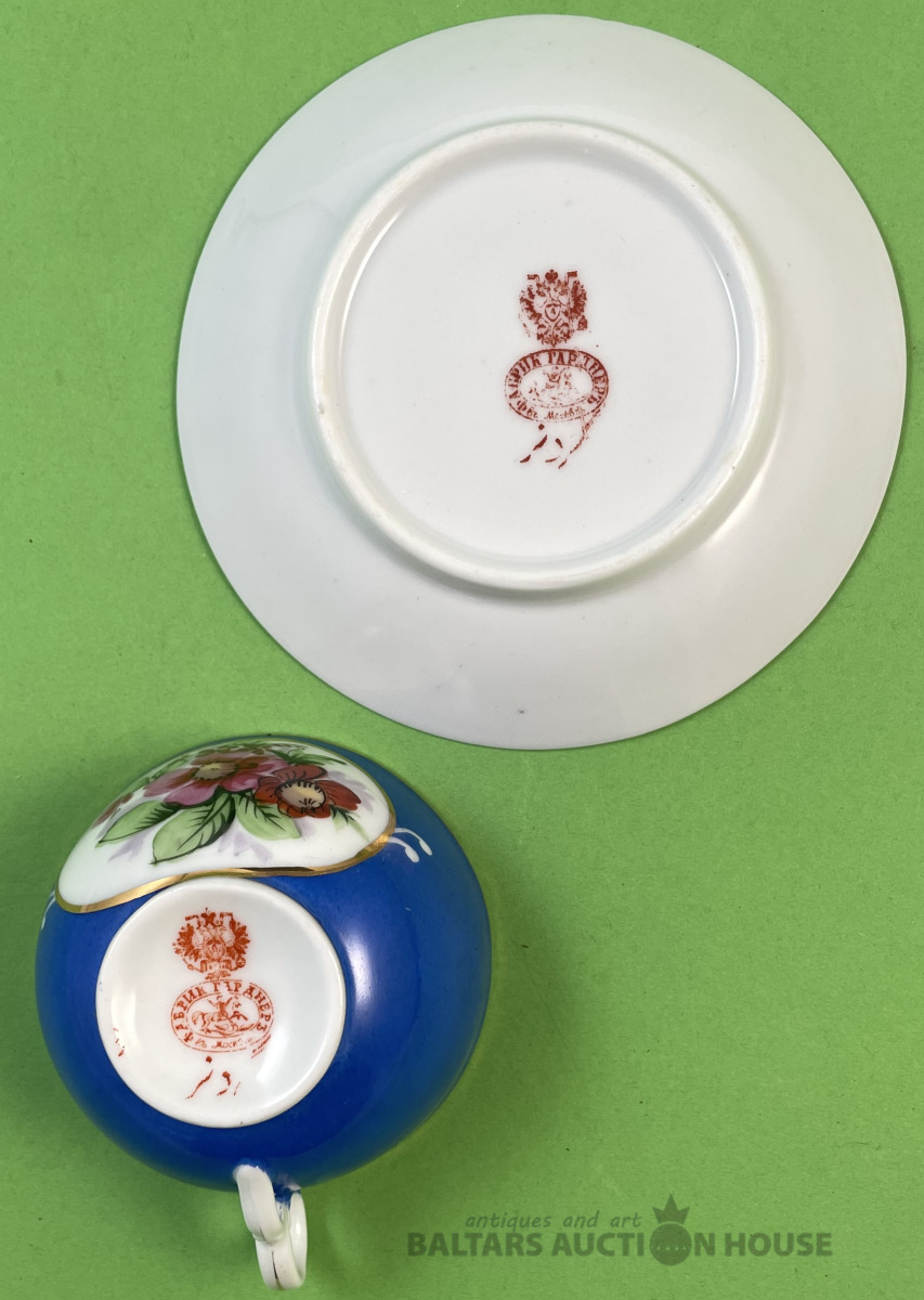 Skaists kafijas pāris, porcelāns, roku gleznojums, zeltījums, ap 1910.g., Gardner zīmogs tuvo austrumu tirgum !!! 1891.gadā Kuzņecovs nopērk Gardnera fabriku un turpina tajā ražot porcelāna izstrādājumus, nemainot fabrikas zīmogu. šīs tases h=4,2 cm, šķīvīša d=12,3 cm
