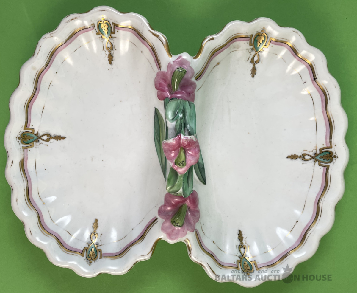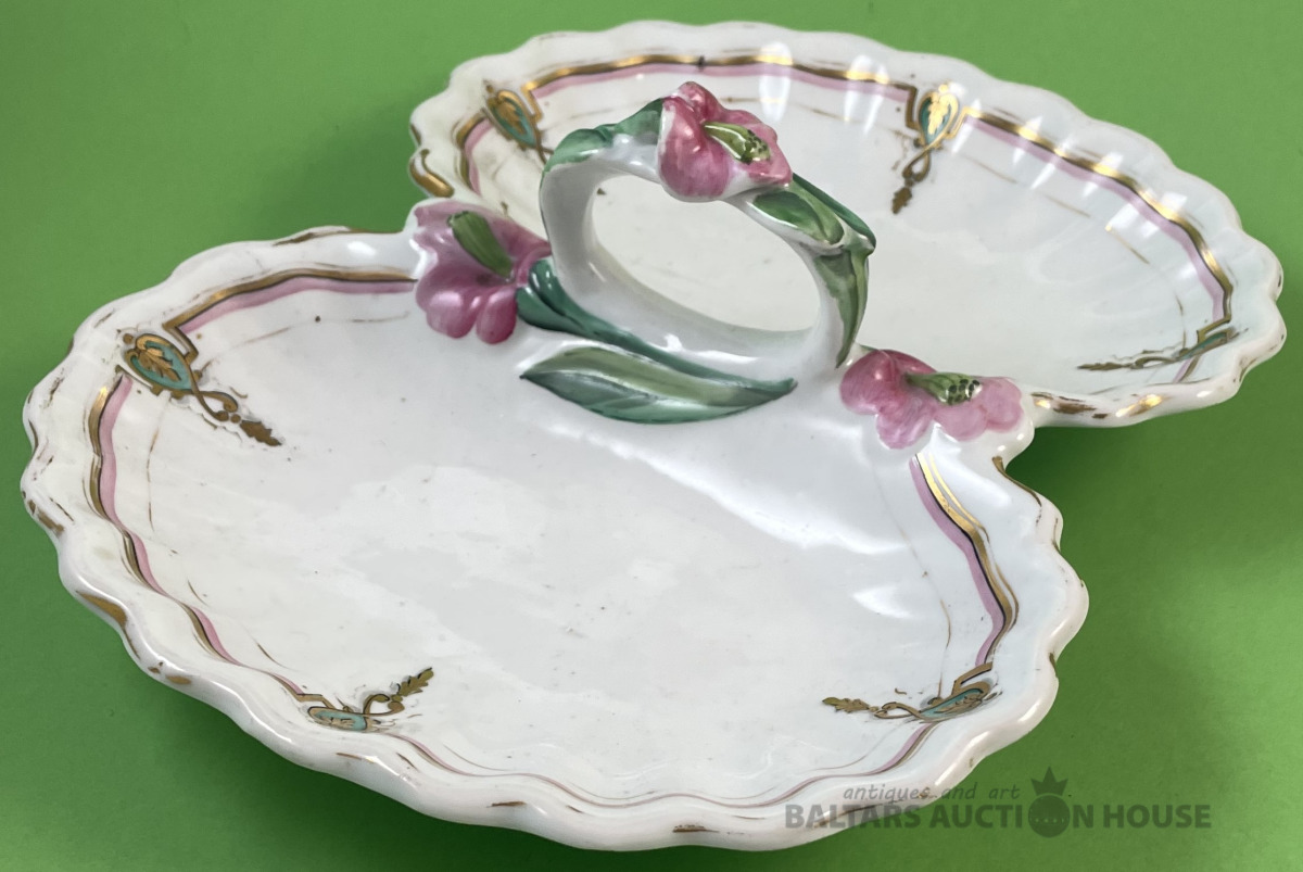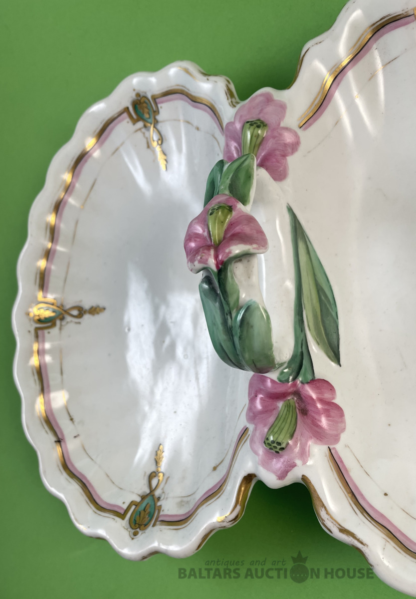 Saldumu trauks ar rokturi, porcelāns, roku gleznojums, zeltījums, JUGENDSTILS, 29,2x23 cm, Kuzņecova f-ka Rīgā, nedaudz padzisis zeltījums