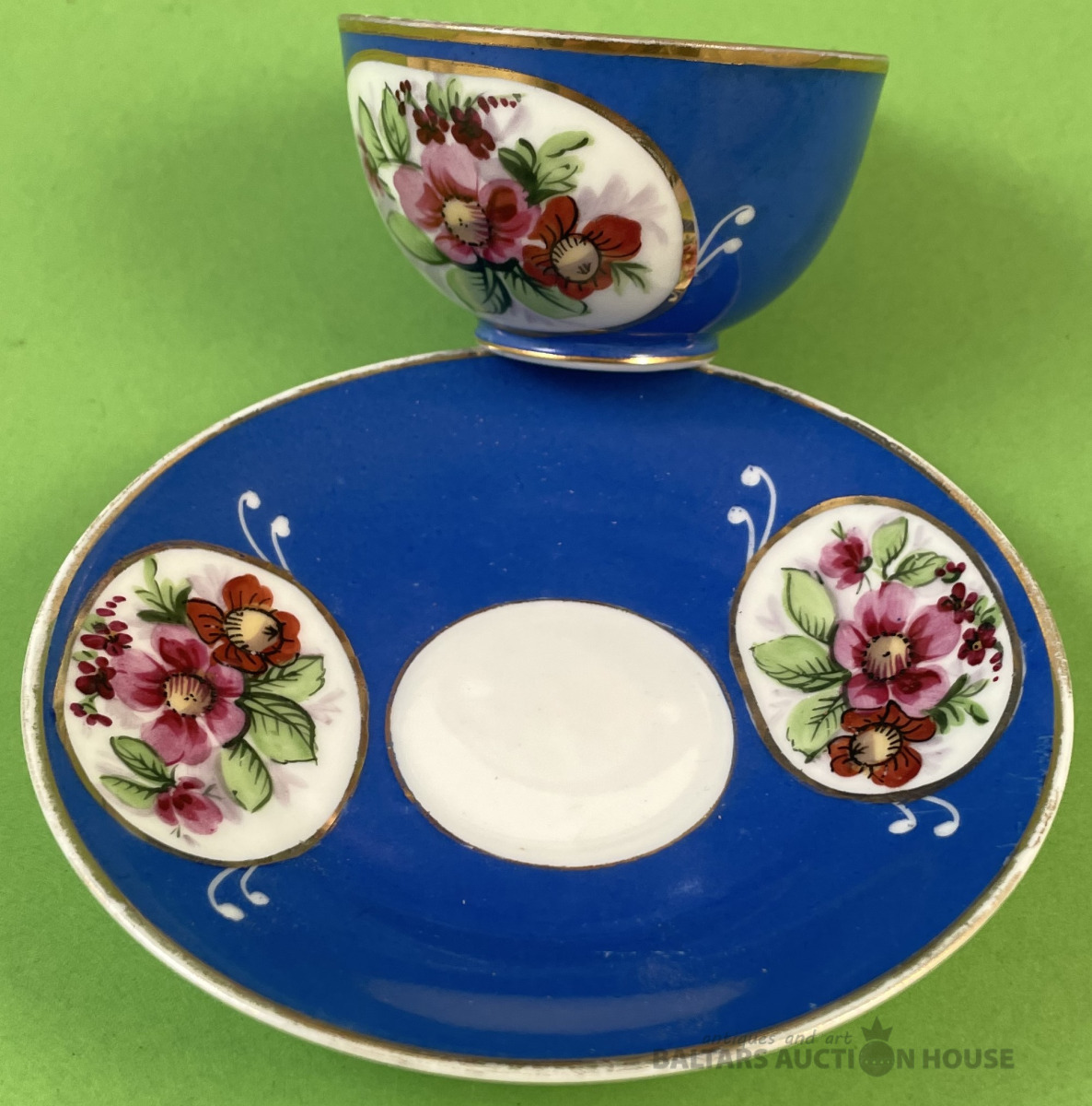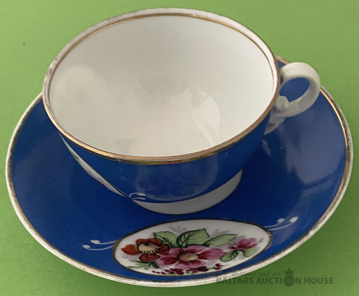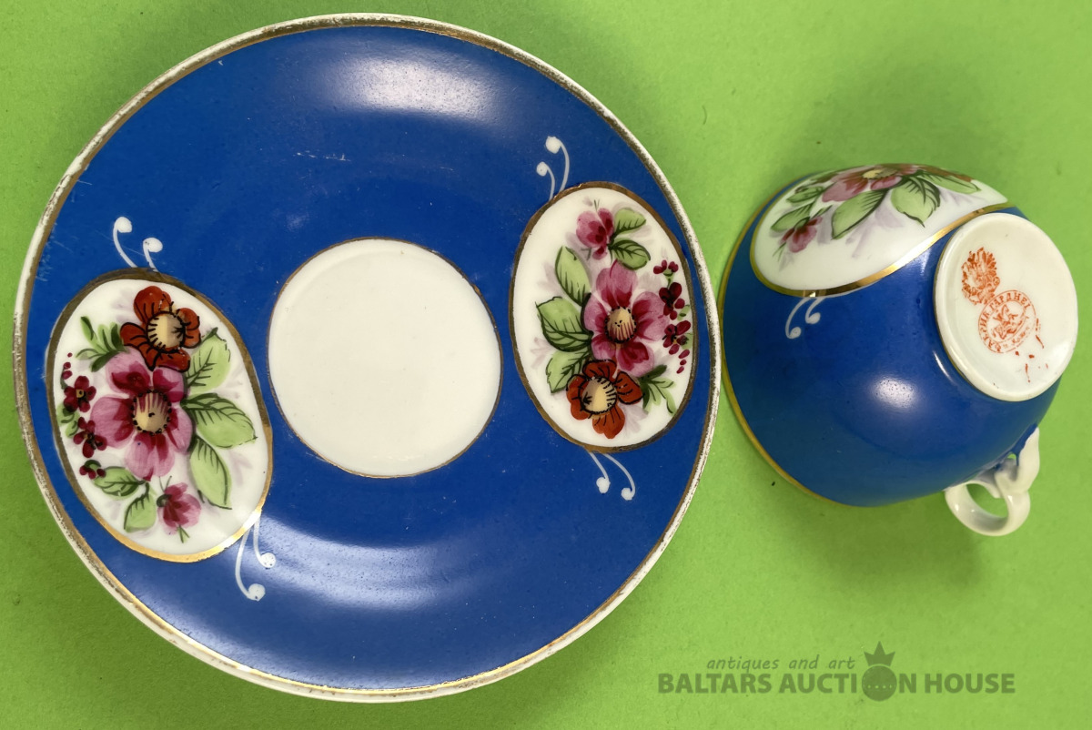 Skaists kafijas pāris, porcelāns, roku gleznojums, zeltījums, ap 1910.g., Gardner zīmogs tuvo austrumu tirgum !!! 1891.gadā Kuzņecovs nopērk Gardnera fabriku un turpina tajā ražot porcelāna izstrādājumus, nemainot fabrikas zīmogu. šīs tases h=4,7 cm, šķīvīša d=12,2 cm