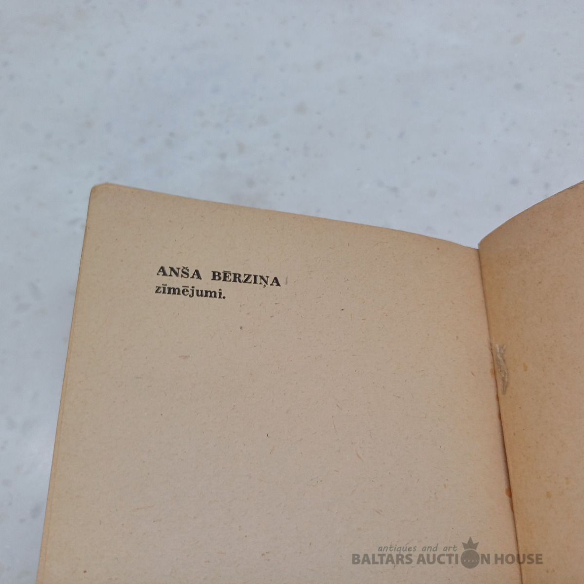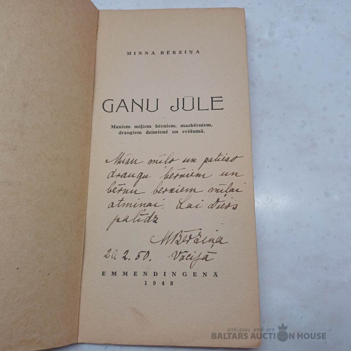 Minna Bērziņa – Ganu Jūle, 1948. g. AR AUTOGRĀFU un ierakstu! / Minna Bērziņa (dzimusi Minna Šarlote Šmidchens, 1880–1968) – literāte, dzejnieka un teologa, profesora Luda Bērziņa dzīvesbiedre. Trimdā sarakstījusi bērnības atmiņu grāmatu "Ganu Jūle". Dēla Anša Bērziņa ilustrācijas