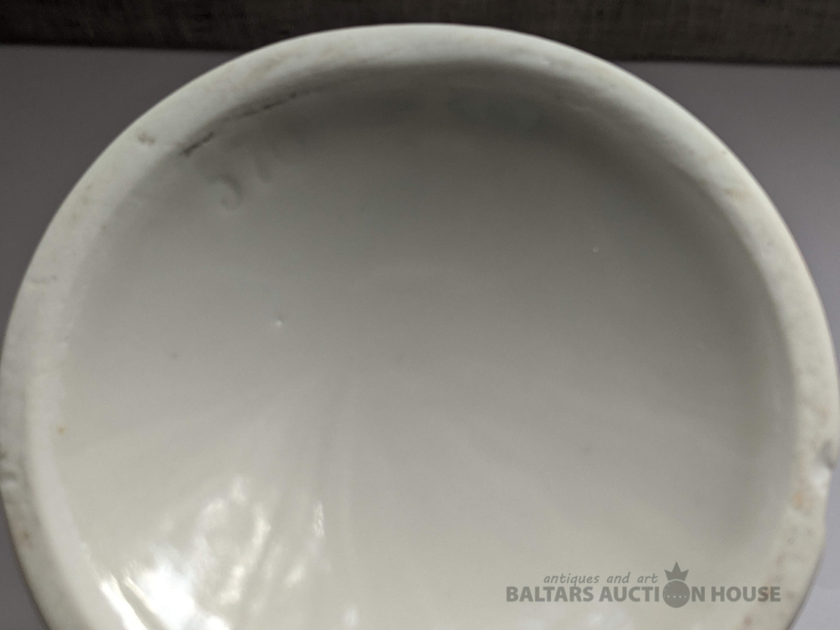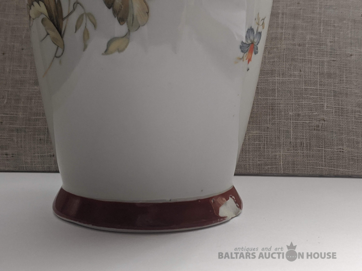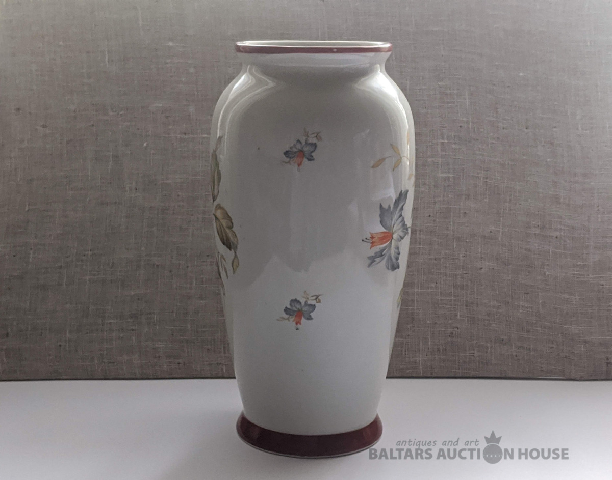 Porcelana vāze, ražota 30-jos gados, bez zimoga, ir masā iespiests cipars, kurš atbilst Kuznecova fabrikā ražotajām vāzēm ar zīmogu un identisku ciparu. defekts- plakanisks virsglazuras atsitums pie pamatnes