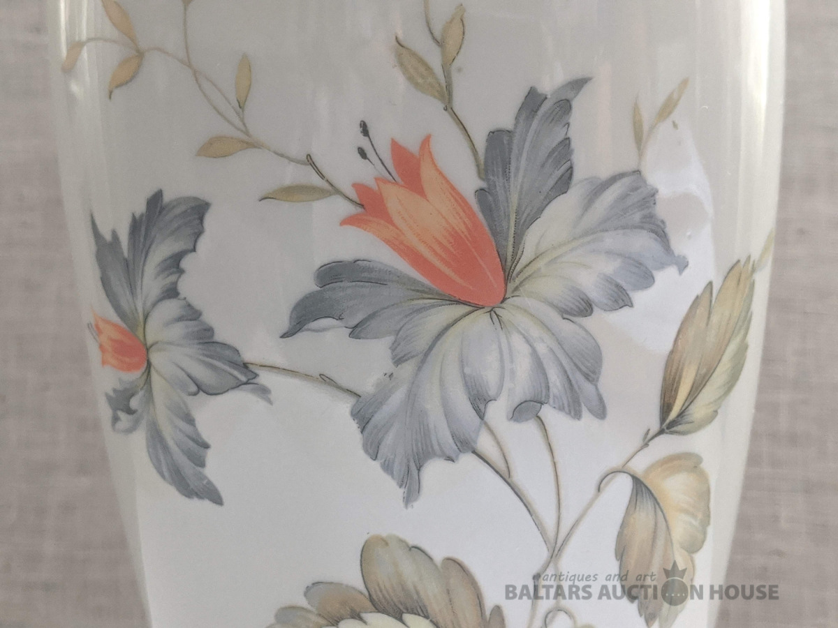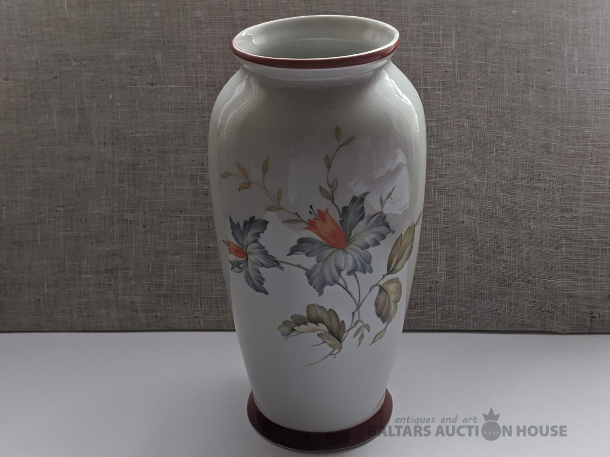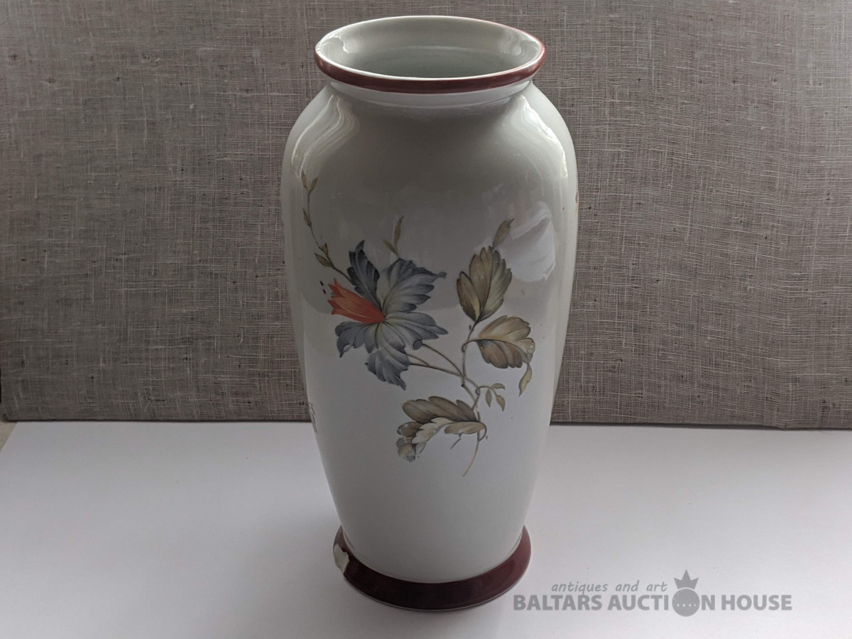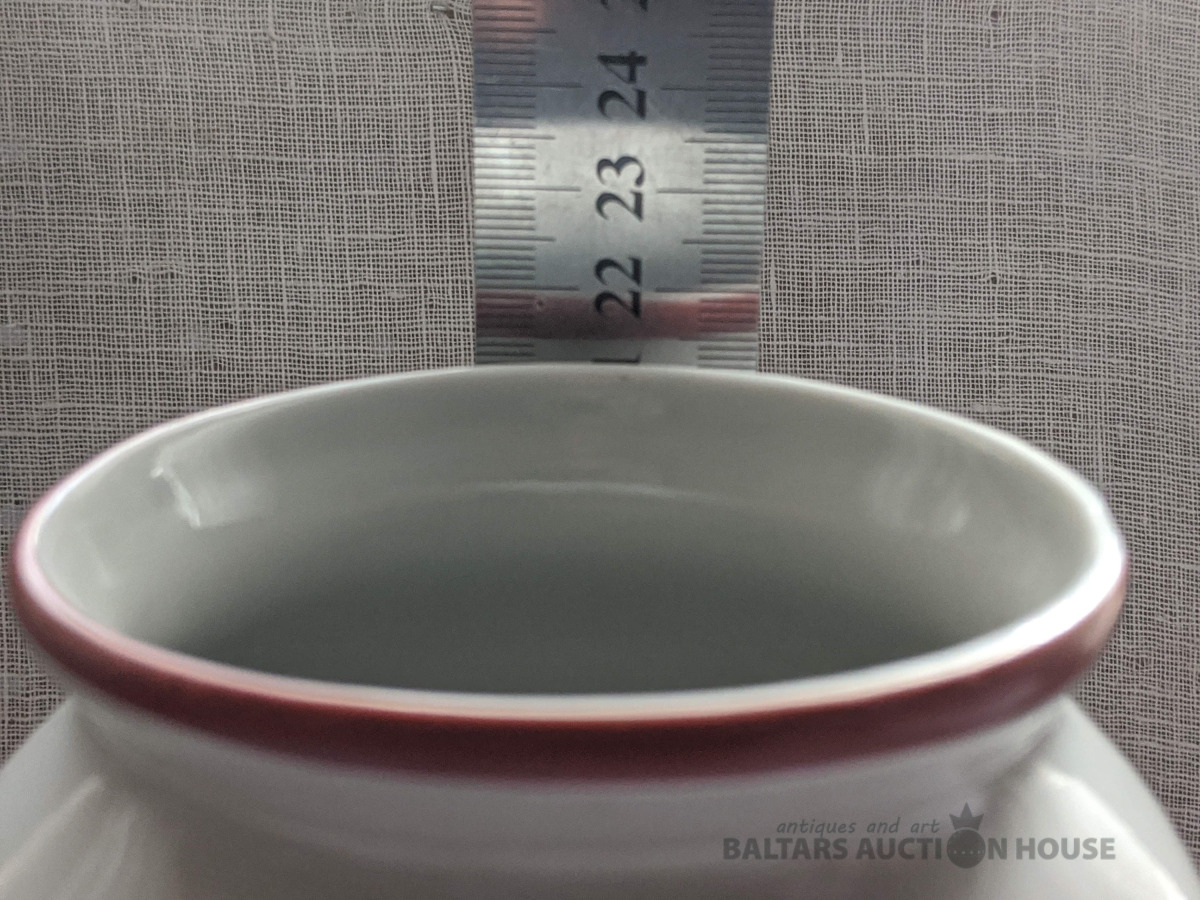 Porcelana vāze, ražota 30-jos gados, bez zimoga, ir masā iespiests cipars, kurš atbilst Kuznecova fabrikā ražotajām vāzēm ar zīmogu un identisku ciparu. defekts- plakanisks virsglazuras atsitums pie pamatnes