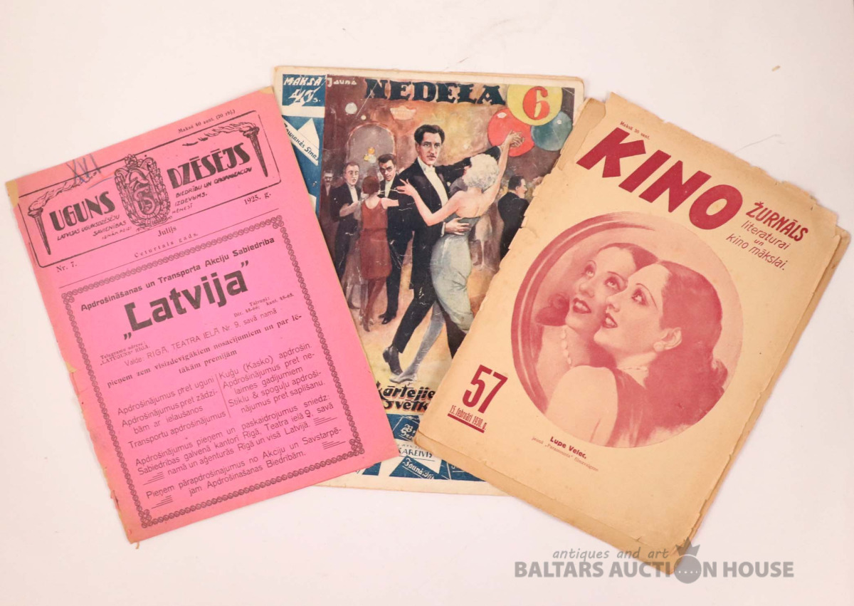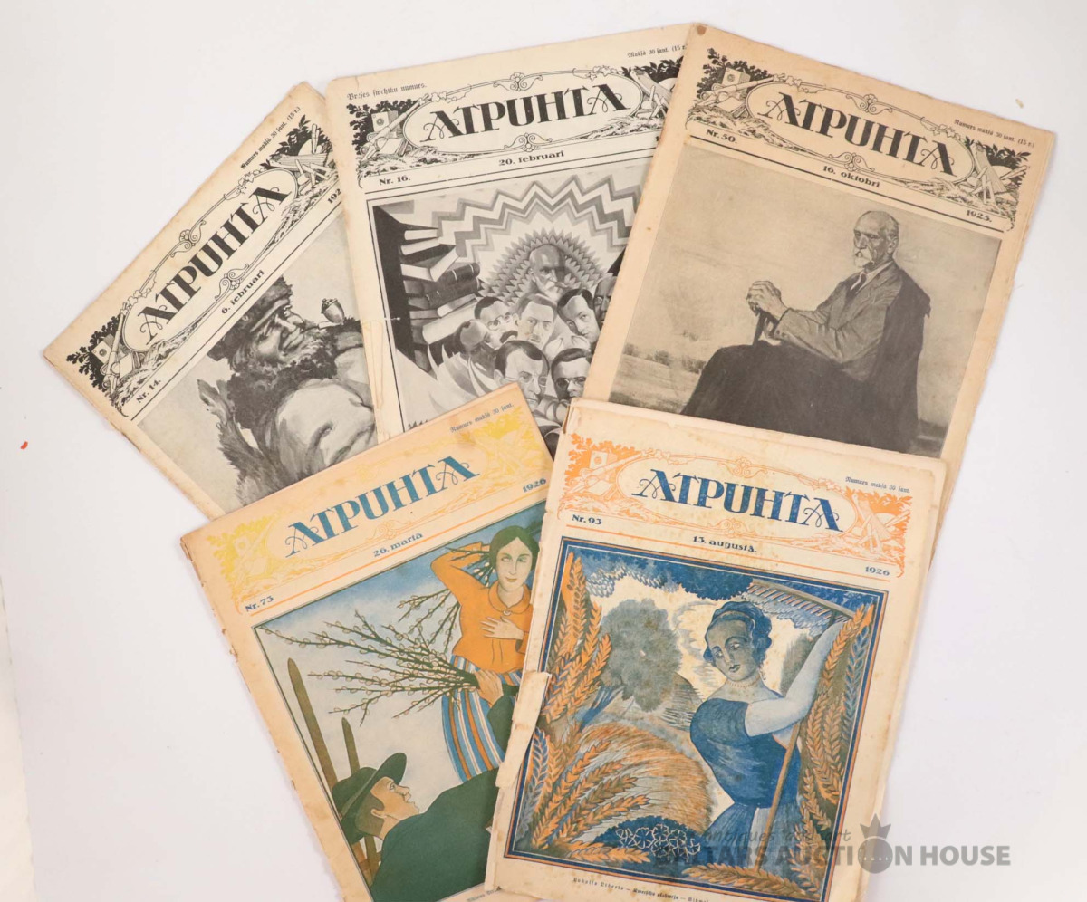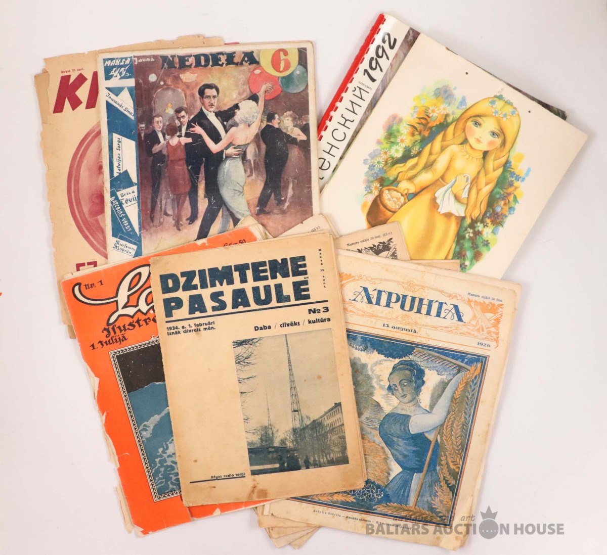 Žurnāli. ATPŪTA, Nr. 14., 16., 50., 73., 93. DZIMTENES PASAULE, 1934. g. Nr. 3. LAIKS, 1924. g. Nr. 1. UGUNSDZĒSĒJS, 1925. g. Nr. 7. NEDĒĻA, 1927. g. Nr. 6. PASAKU KALENDĀRS 1984. un SIEVIEŠU KALENDĀRS 1992.
