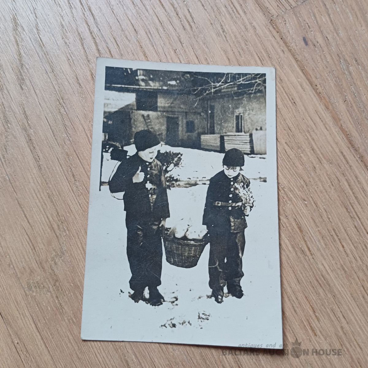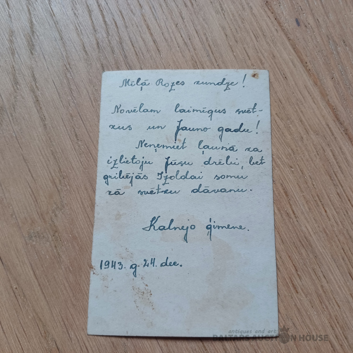 Foto: Bērni ar sivēniem 1943. g. ziemā. Otrā pusē apsveikums Jaunajā gadā.