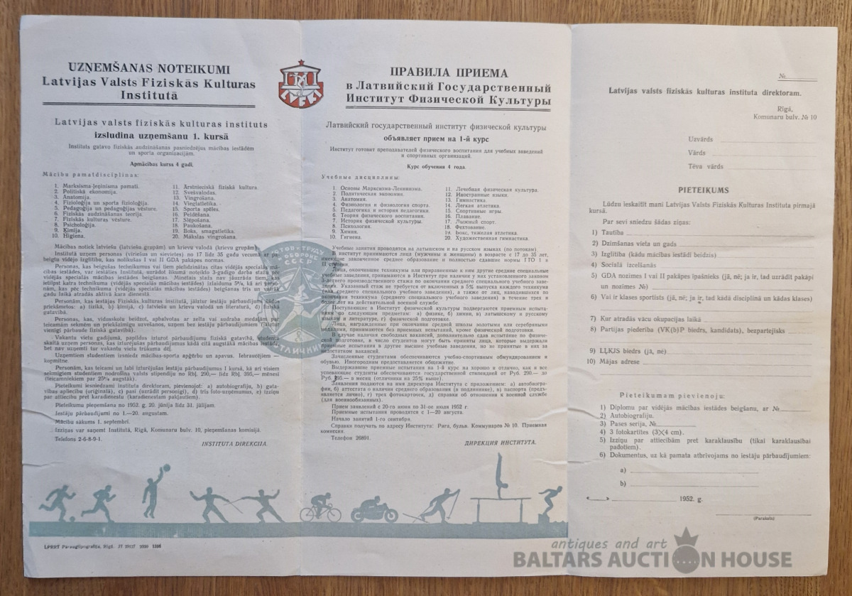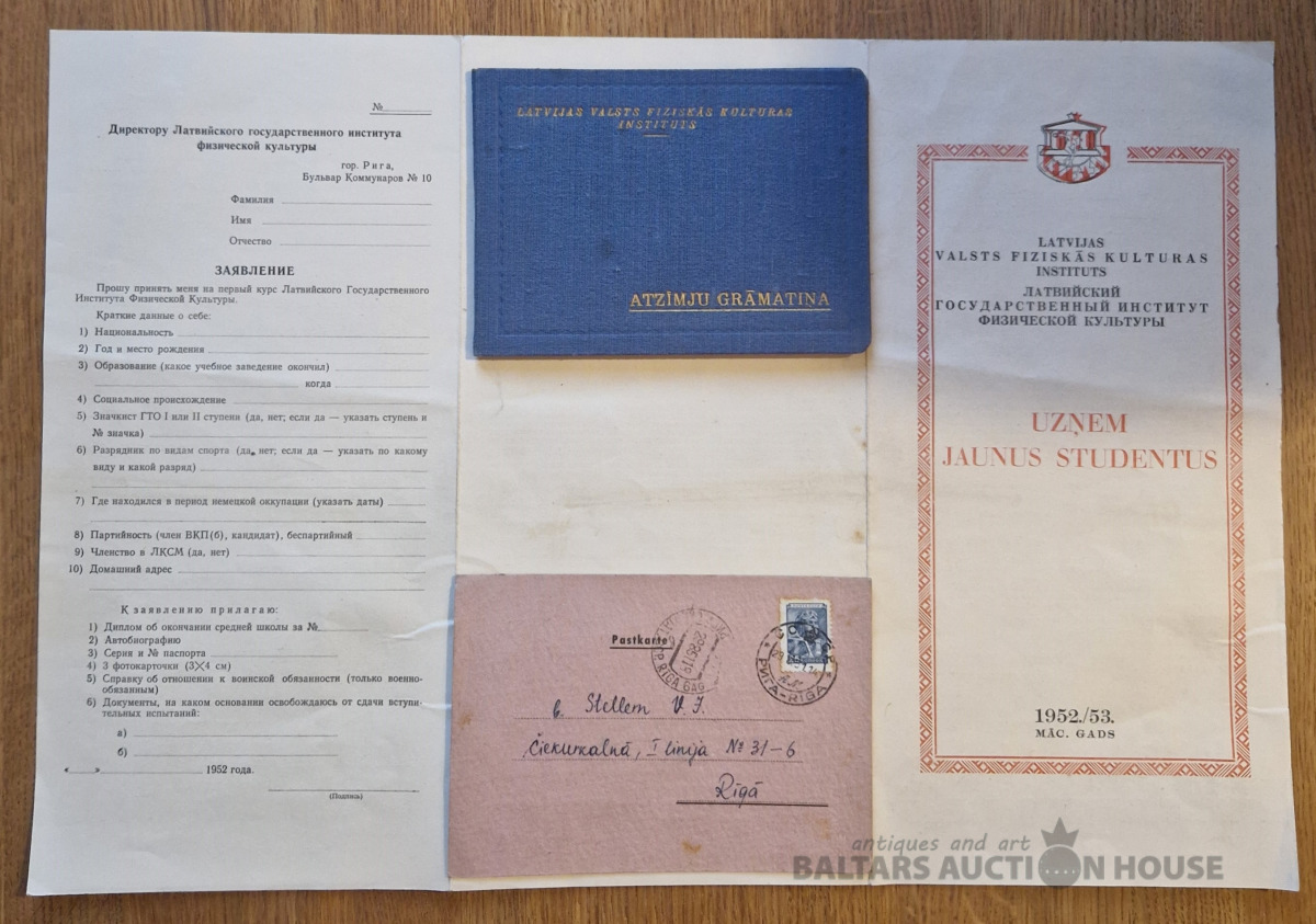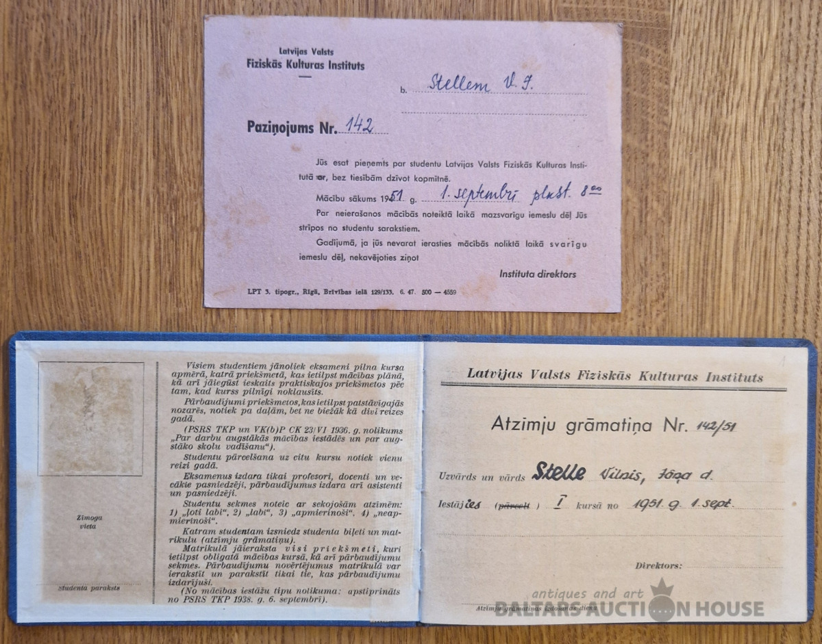Nr.1786. 3 gab. Jaunu studentu uzņemšana Latvijas Valsts Fiziskās Kultūras Institūtā 1952./53. māc. gads; Latvijas Valsts Fiziskās Kultūras Institūta Atzīmju grāmatiņa, 1951. gads; Latvijas Valsts Fiziskās Kultūras Institūta Paziņojums Nr.142, 1951. gads