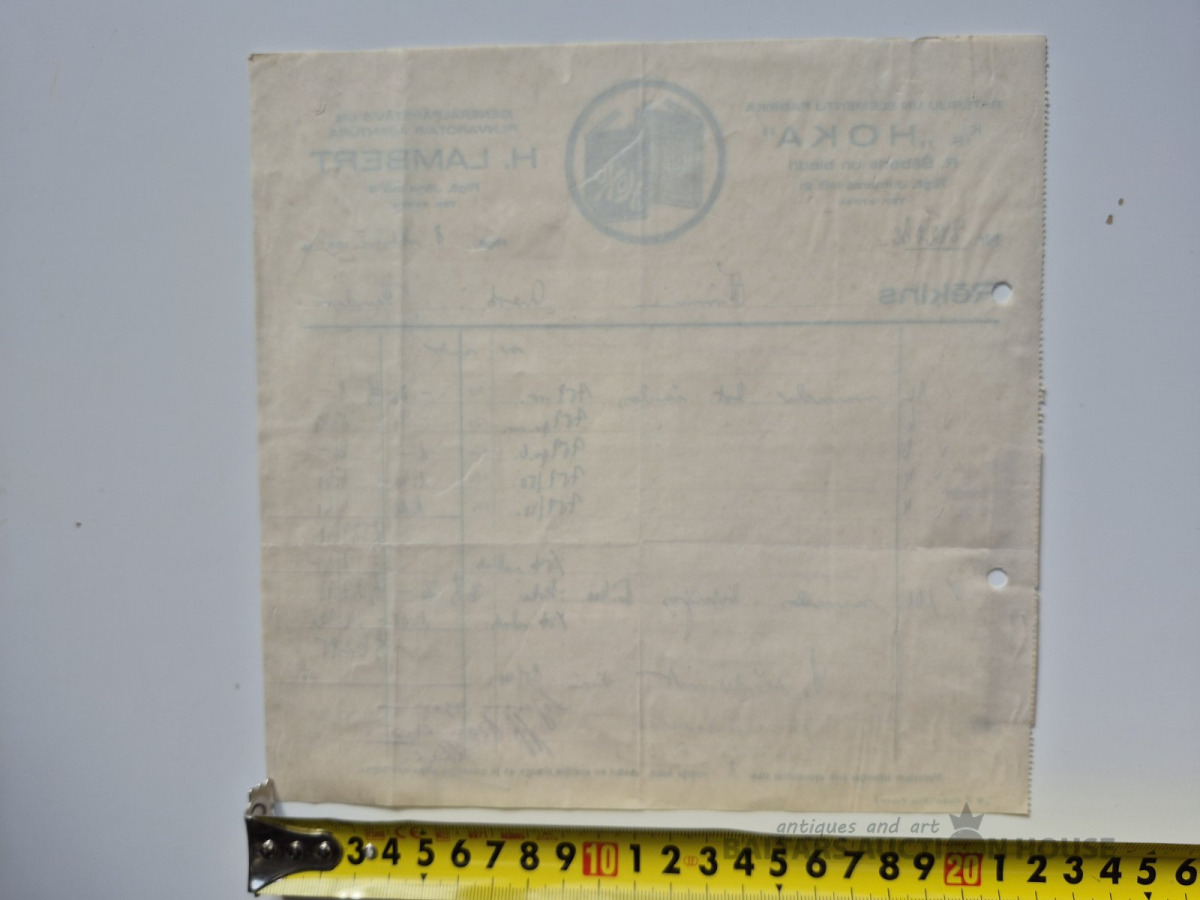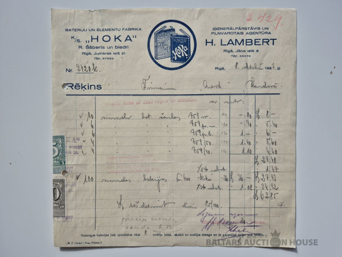 Rēķins. Bateriju un elementu fabrika K/S " Hoka", 1937g.