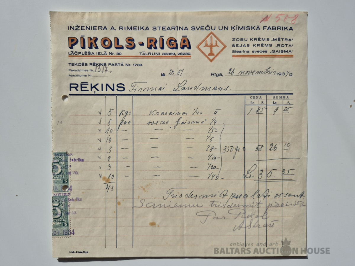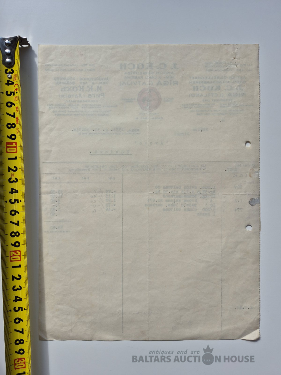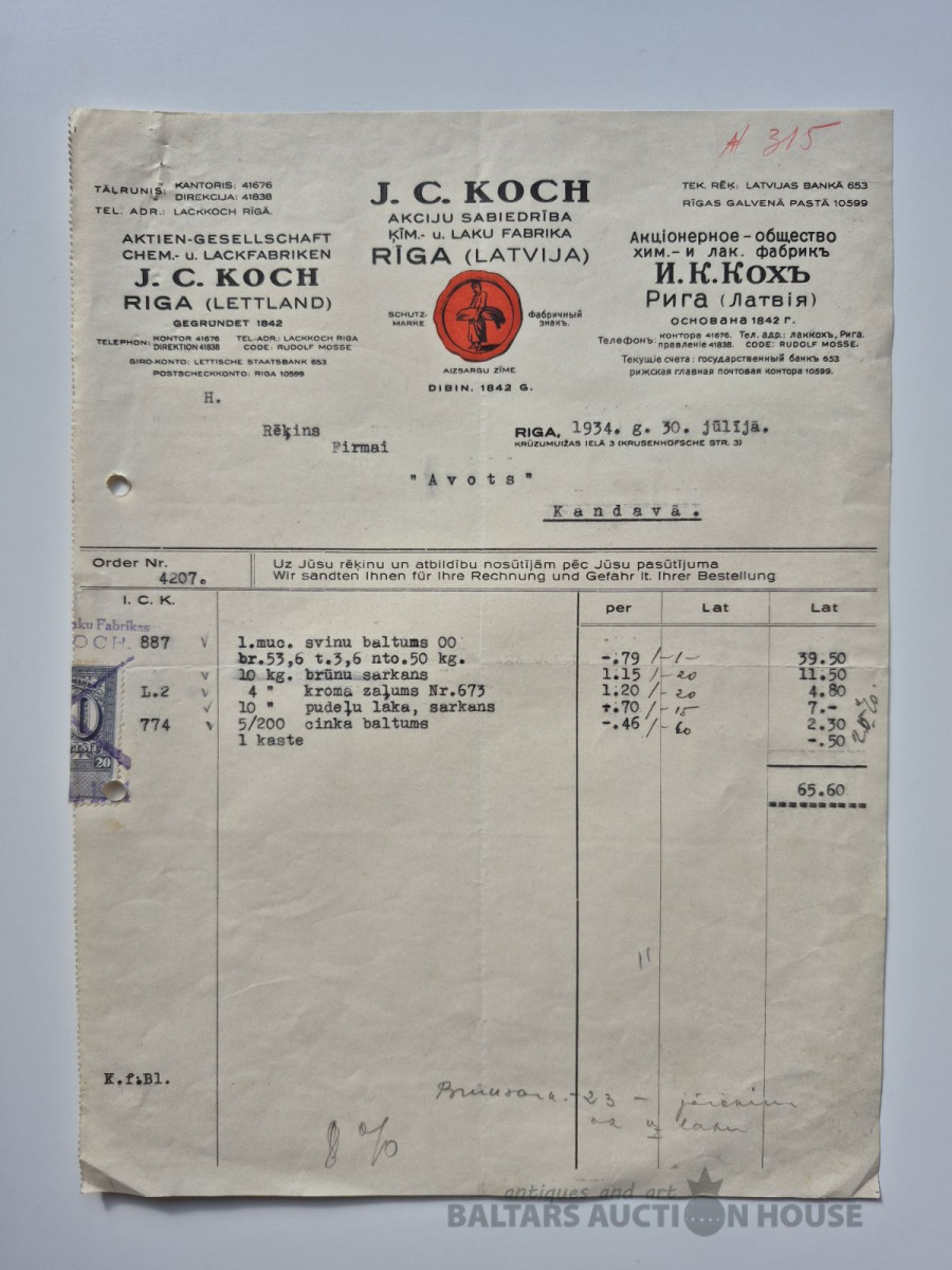 Rēķins. Akciju sab-ba ķīm.- u.laku fabrika J. C. Koch Rīgā, 1934g.