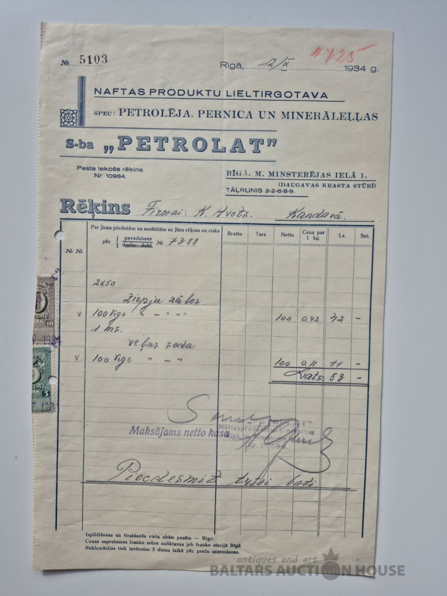 Rēķins. Naftas produktu lieltirgotava S-ba "Petrolat", 1934g.