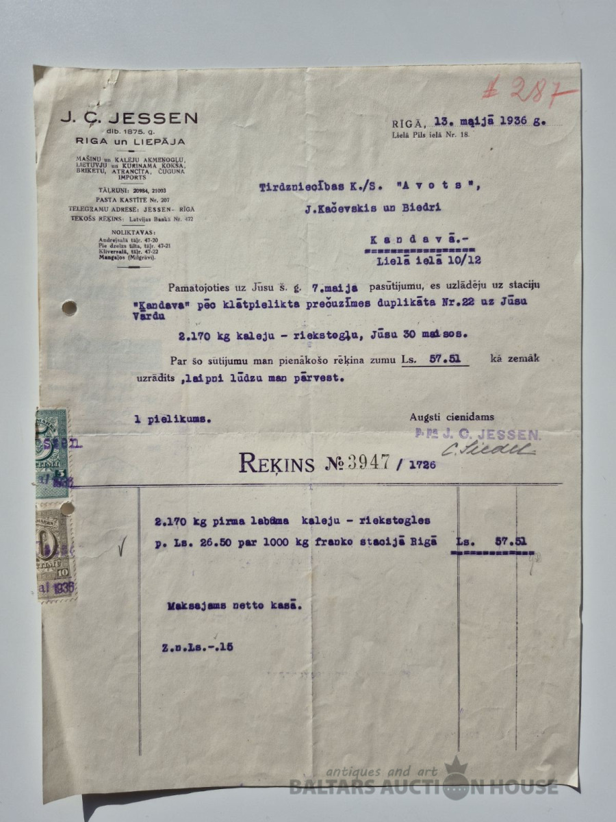 Rēķins. Mašīnu un kalēju akmeņogļu imports, 1936g.
