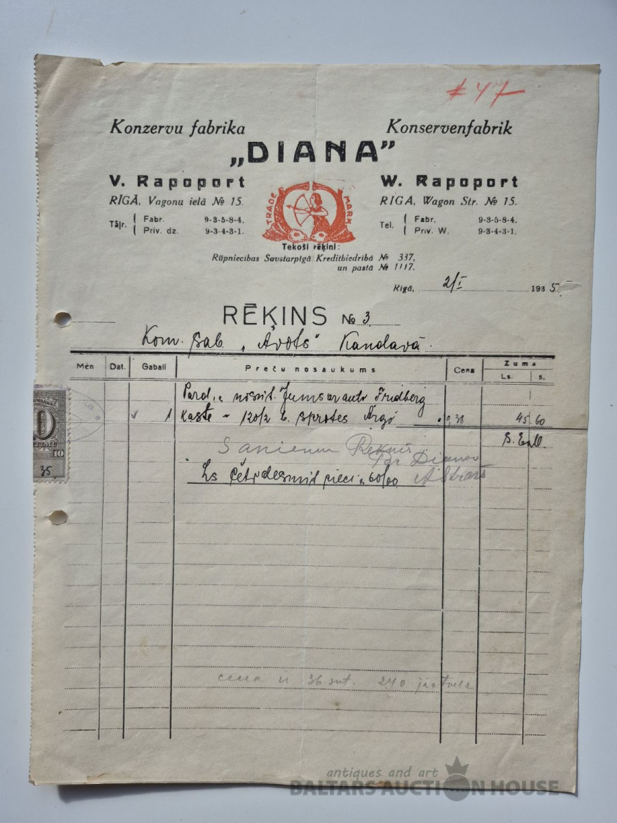Rēķins. Konservu fabrika "Diana", 1935g.
