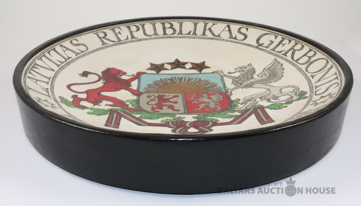 Sienas šķīvis LATVIJAS REPUBLIKAS ĢERBONIS. Autors Ēriks Priedkalns, roku gleznojums, āda, porcelāns. h=5,7 cm, d=36 cm