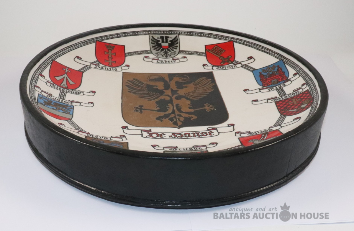 Sienas šķīvis DE HANSE. Autors Ēriks Priedkalns, roku gleznojums, āda, porcelāns. h=6,3 cm, d=35,3 cm