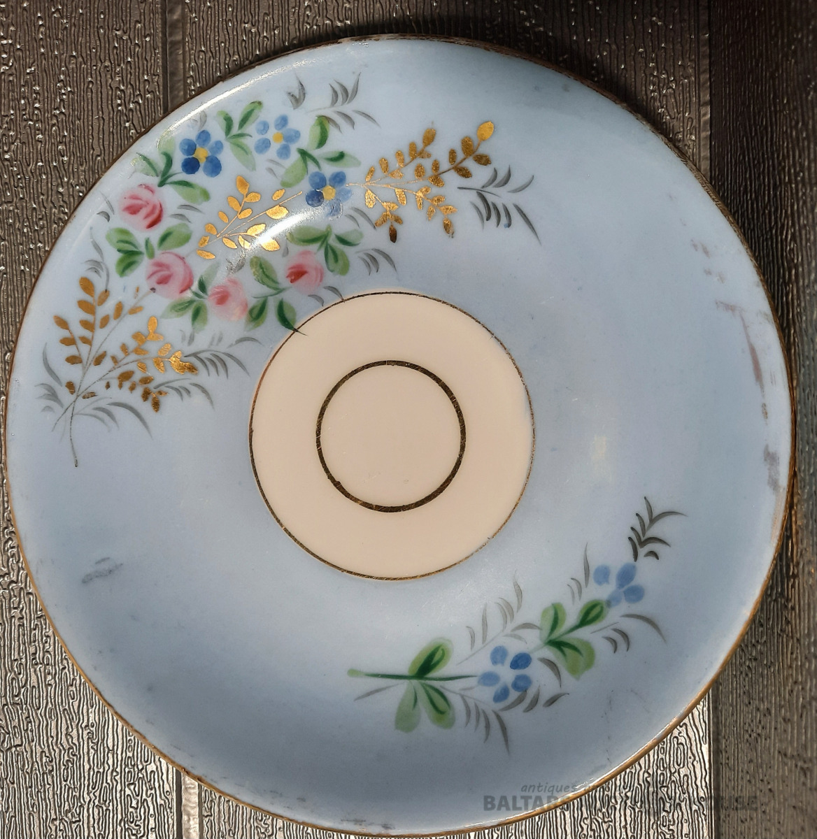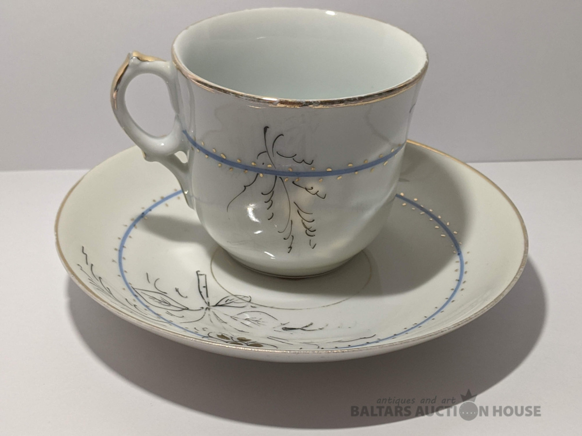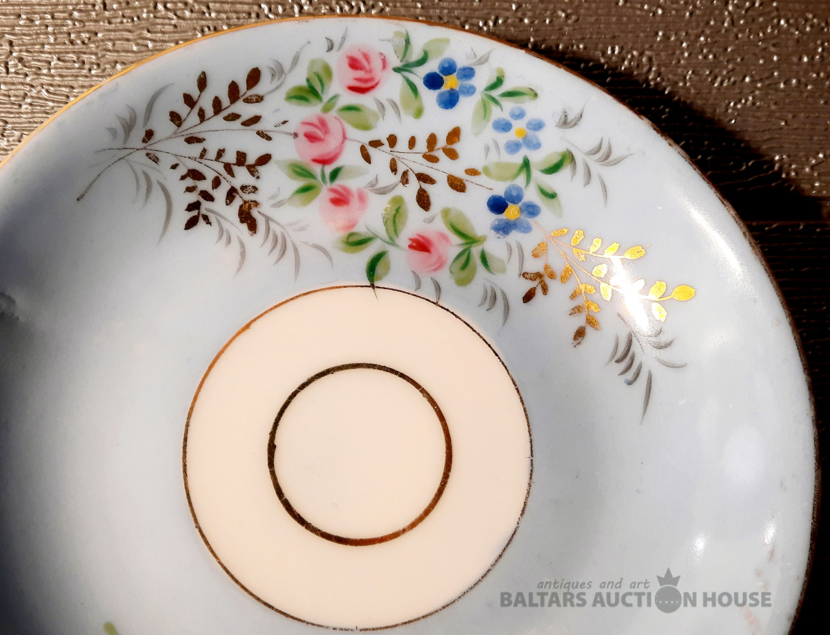 Cara laiku tasīte ar apakštasi, KUZNECOVA fabrika, ražots līdz 1915.gadam. Rokas zīmējums,ir apakštasei sīki divi atsitumi un glazurā plaisājums , zeltam lietojuma pazīmes- atbilstoši vec