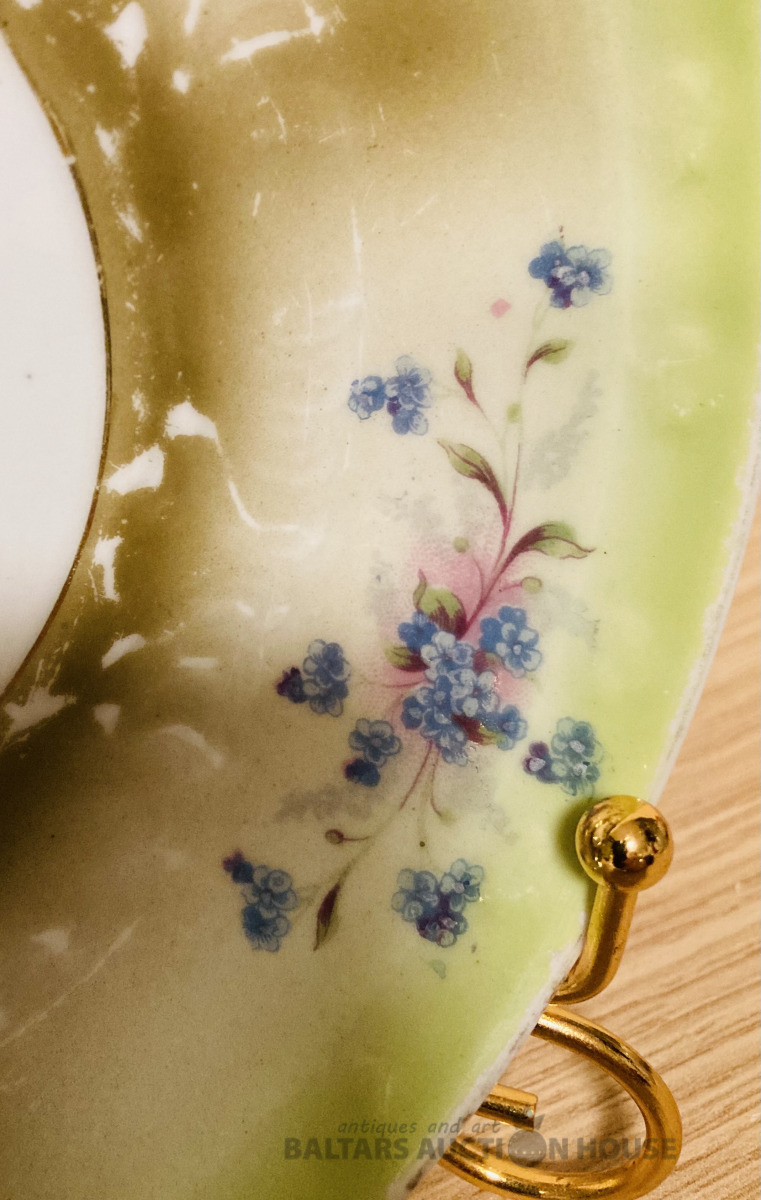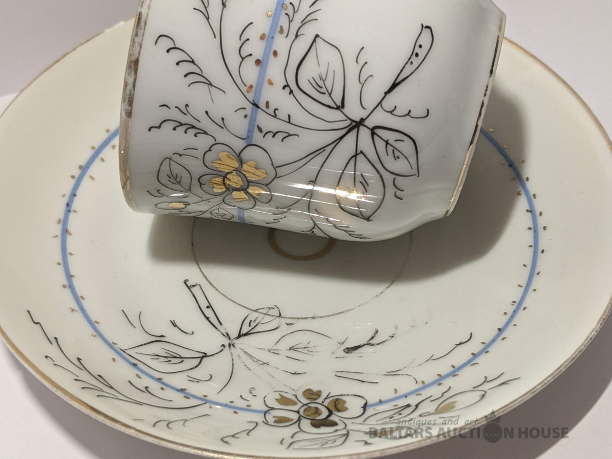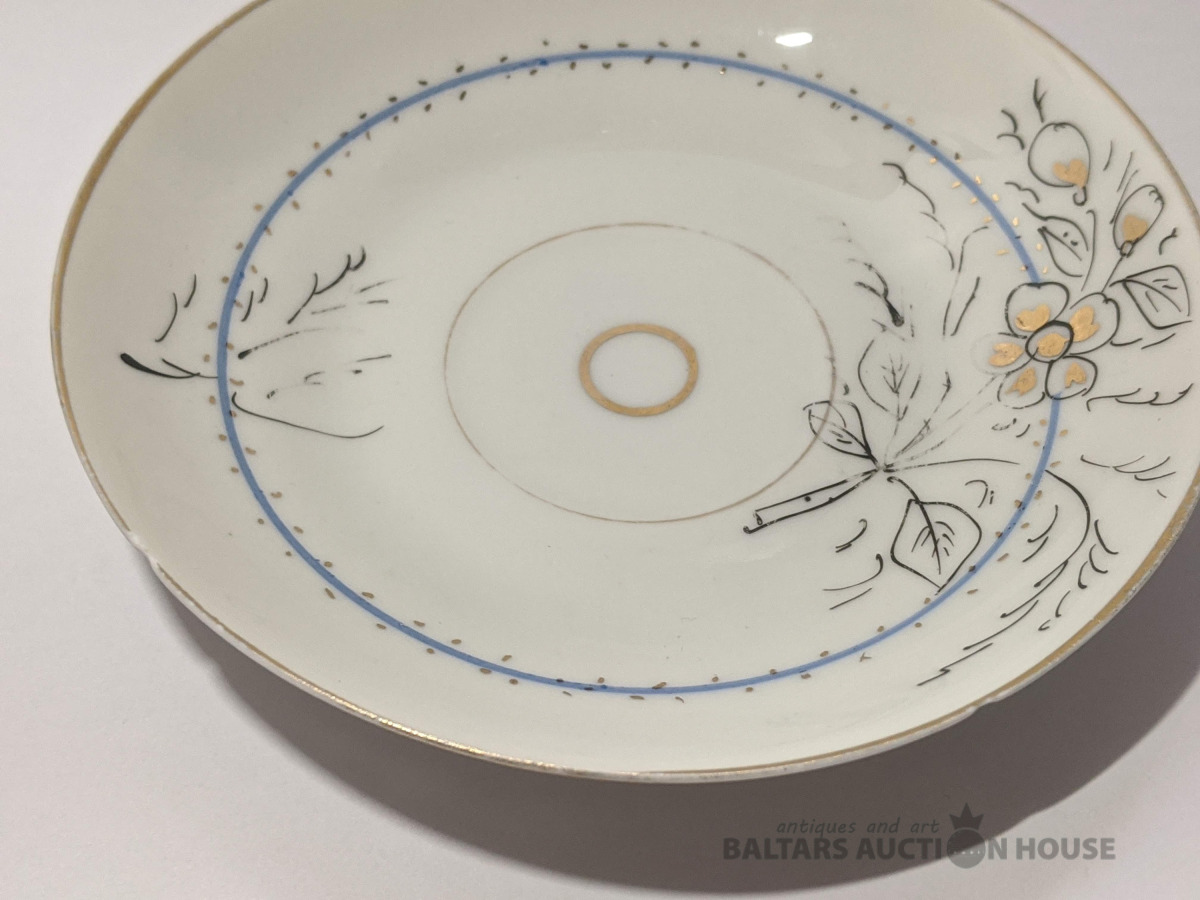 Cara laiku tasīte ar apakštasi, KUZNECOVA fabrika, ražots līdz 1915.gadam. Rokas zīmējums,ir apakštasei sīki divi atsitumi un glazurā plaisājums , zeltam lietojuma pazīmes- atbilstoši vec