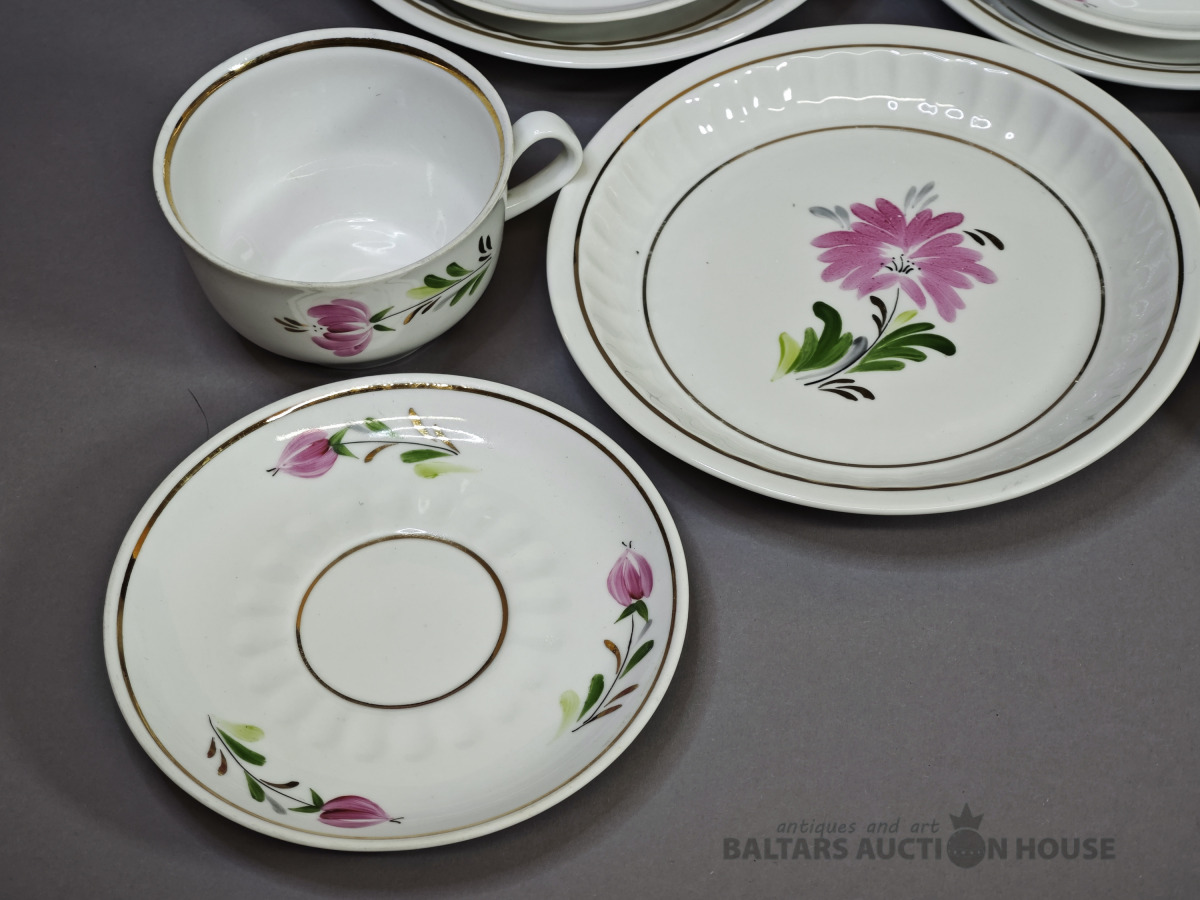 Servīze 7 personām. Porcelāns, dekols. JLMENAU Graf Von Henneberg Porzellan. Tases h=5,4 cm, d=5,9 cm. Apakštases d=11,3 cm. h=7,5 cm, 8,2 cm un 16,7 cm. Ar iepakojuma kasti.