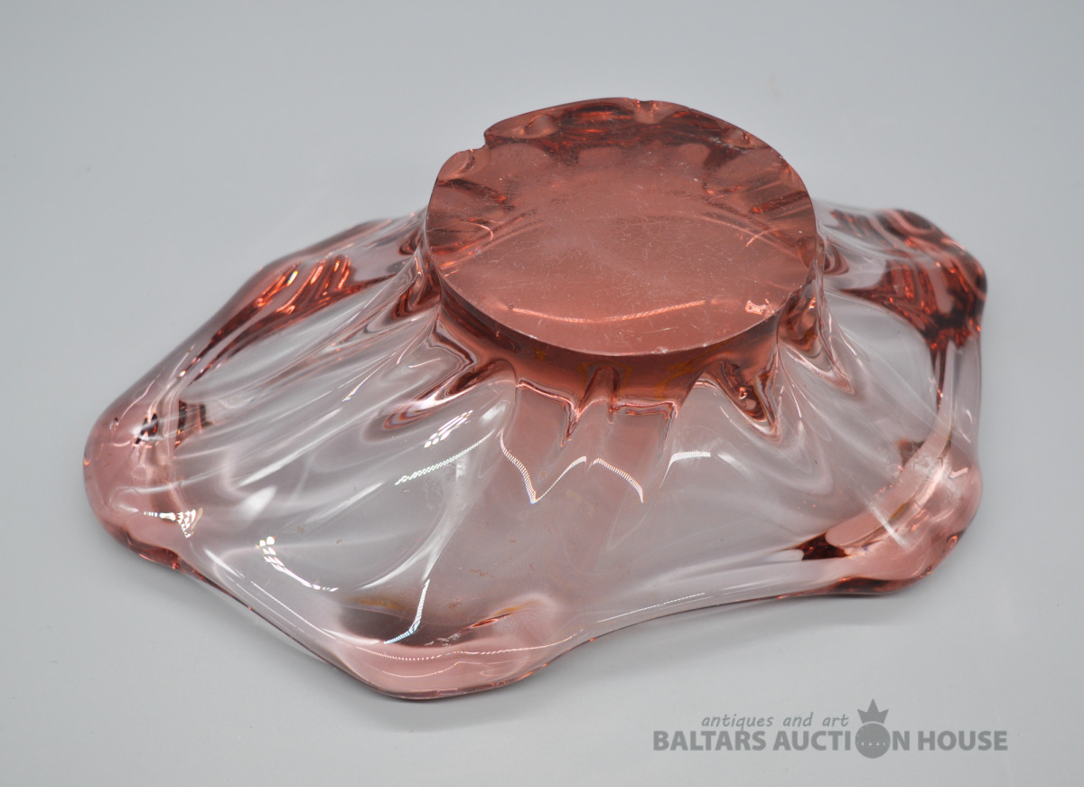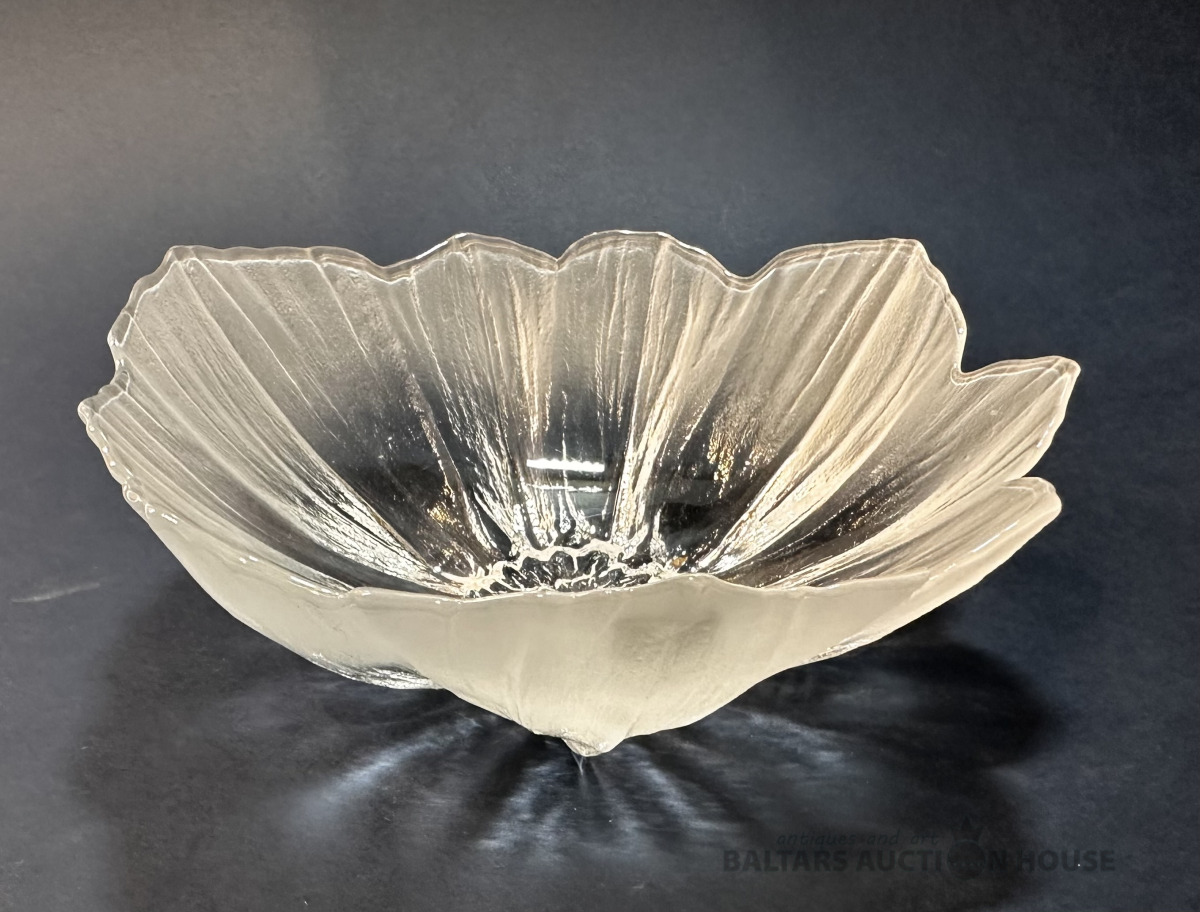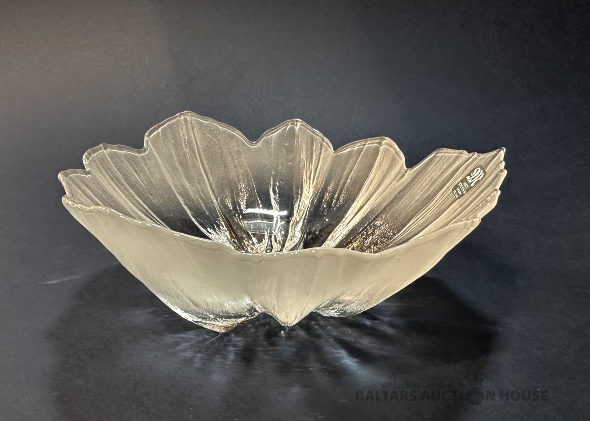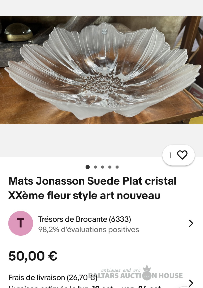 Kristāla saldumu trauks, Dizaina priekšmets no zviedru zīmola Mats Jonasson, uzplaukuša zieda forma, vidus dzidrs, uz malām pakāpeniski pāriet uz matētu, dimetrs 15 cm. Pēdējais foto no interneta.
