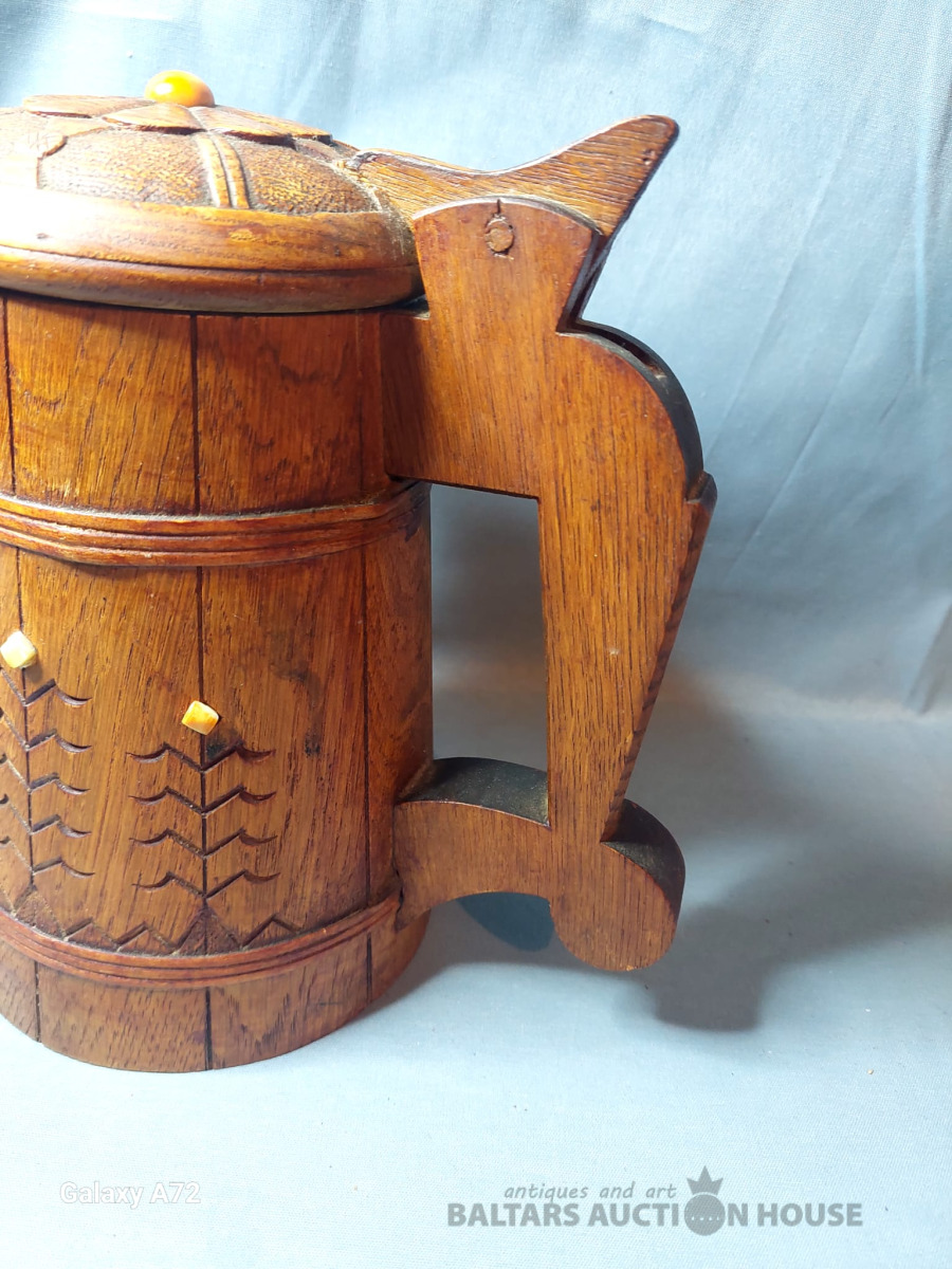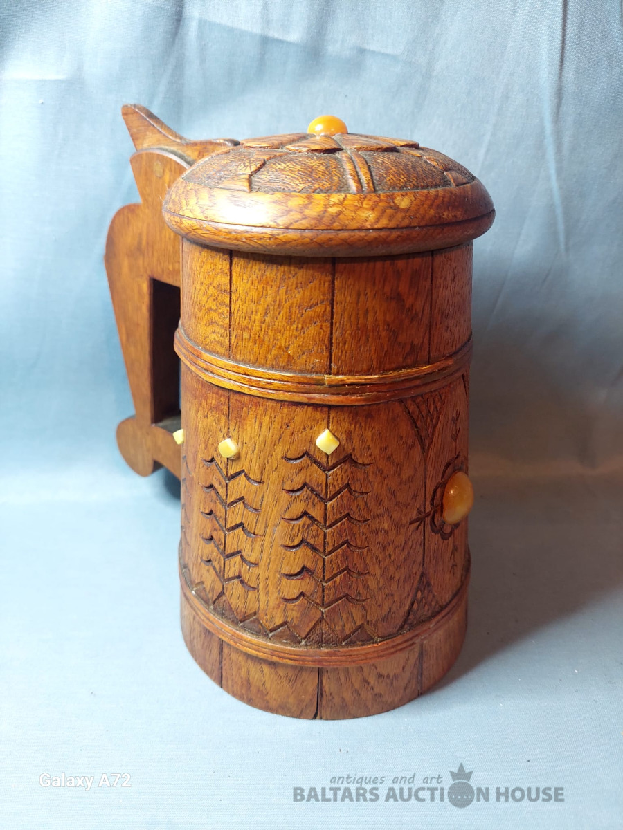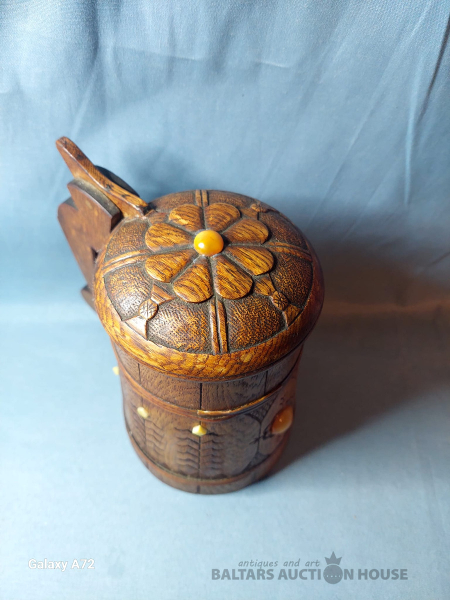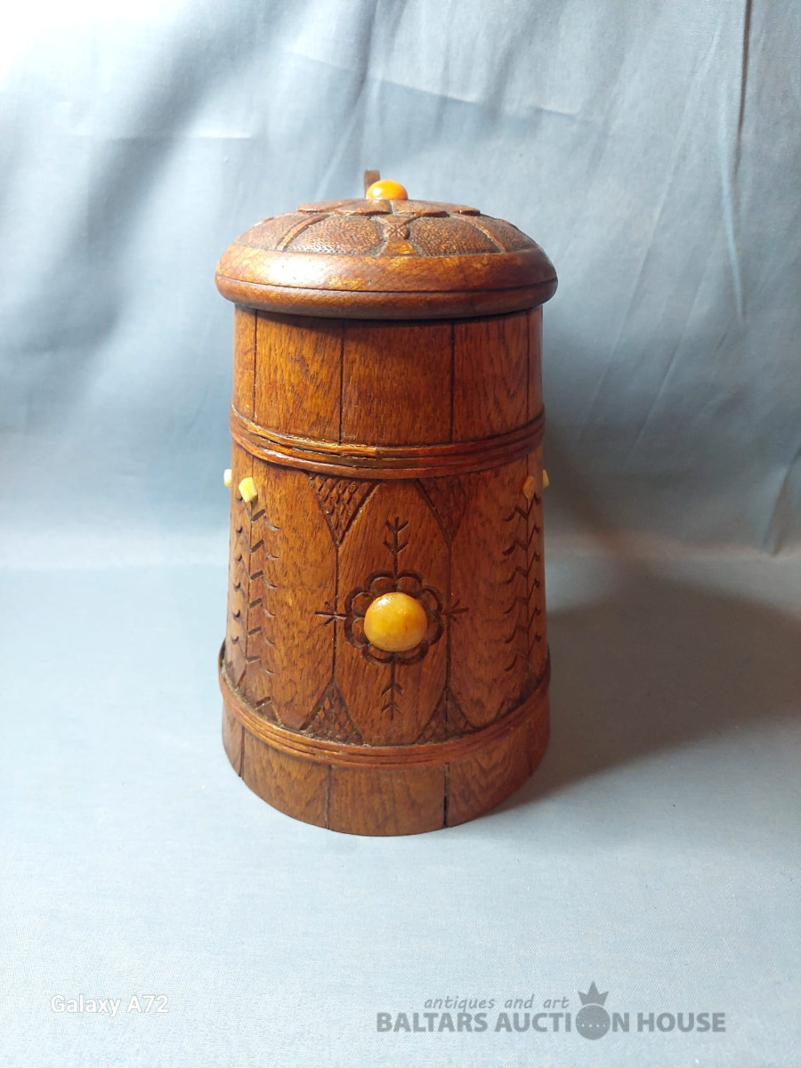 Koka alus krūze ar tautisku rakstu un dzintaru, roku darbs. 1951.gads. , H-20cm.