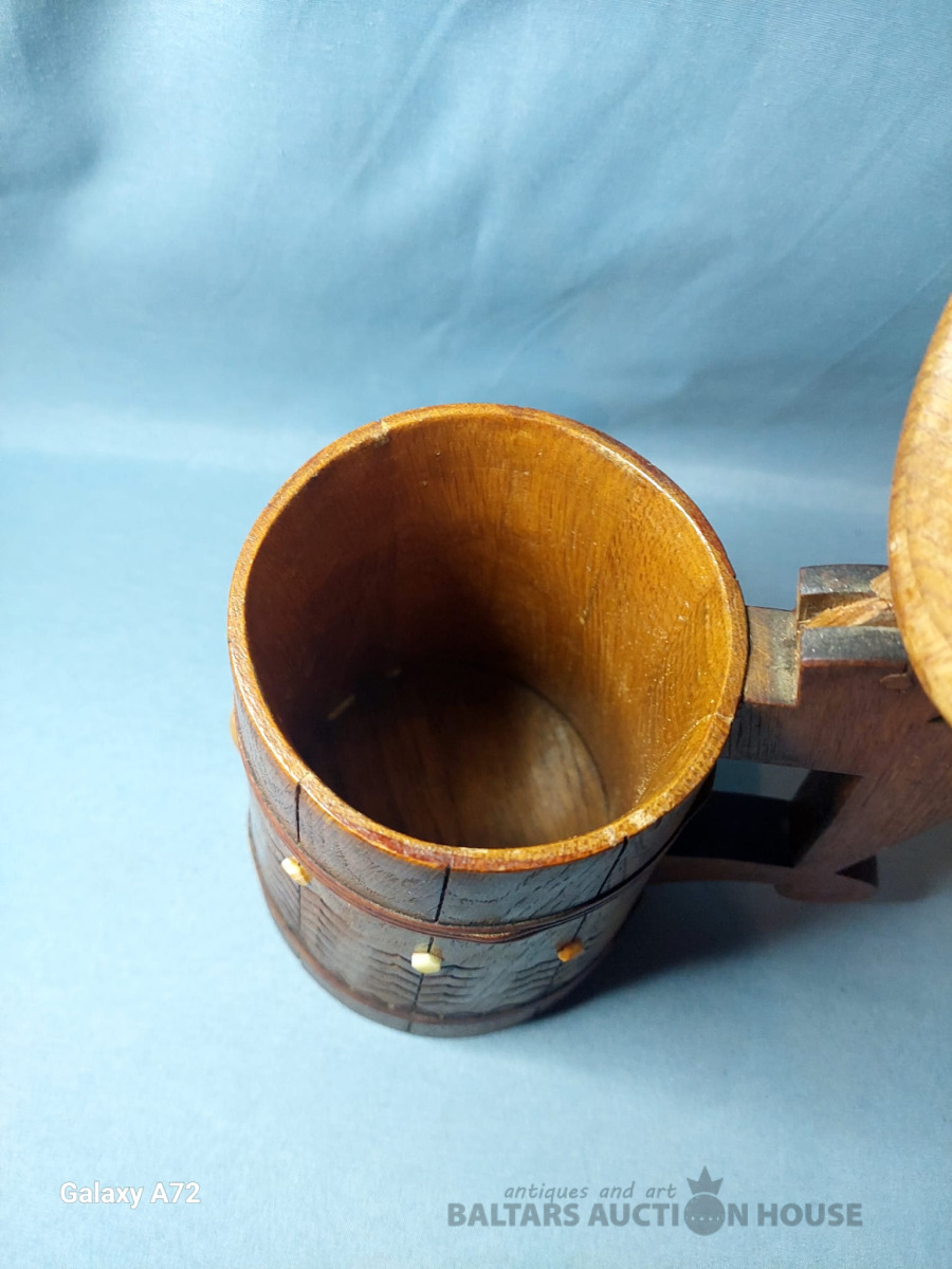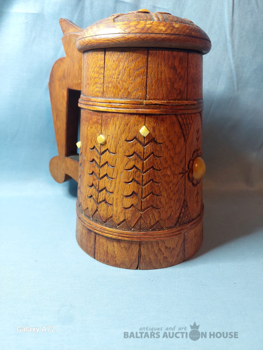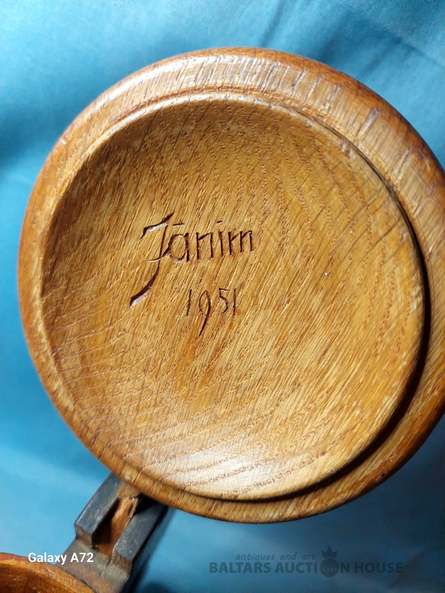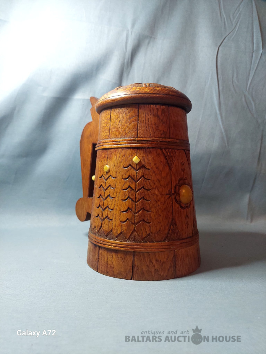 Koka alus krūze ar tautisku rakstu un dzintaru, roku darbs. 1951.gads. , H-20cm.