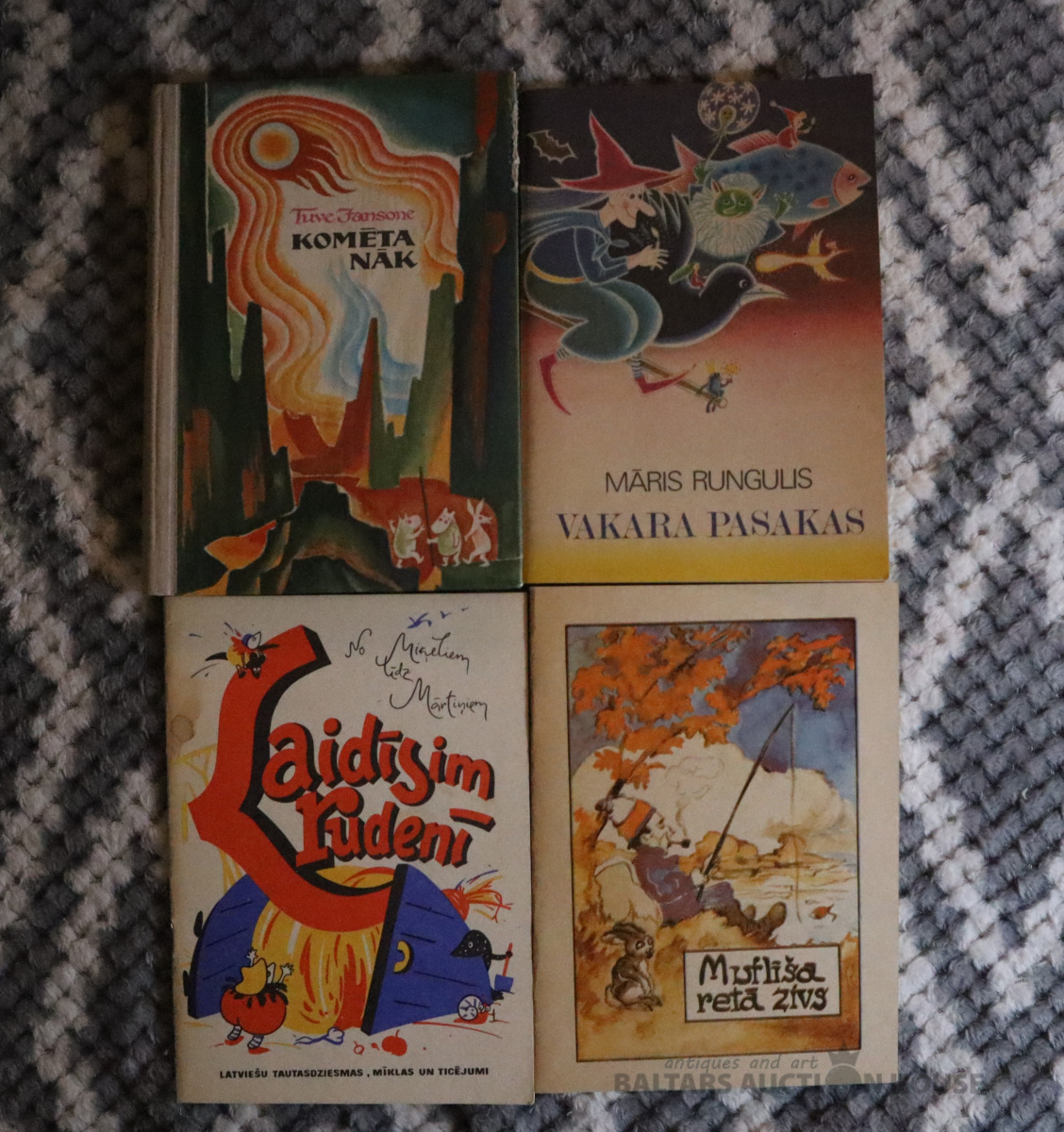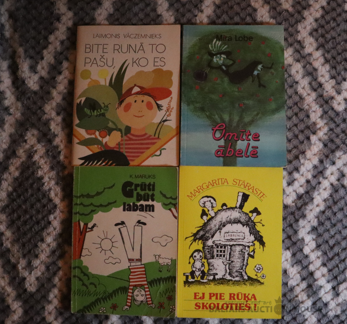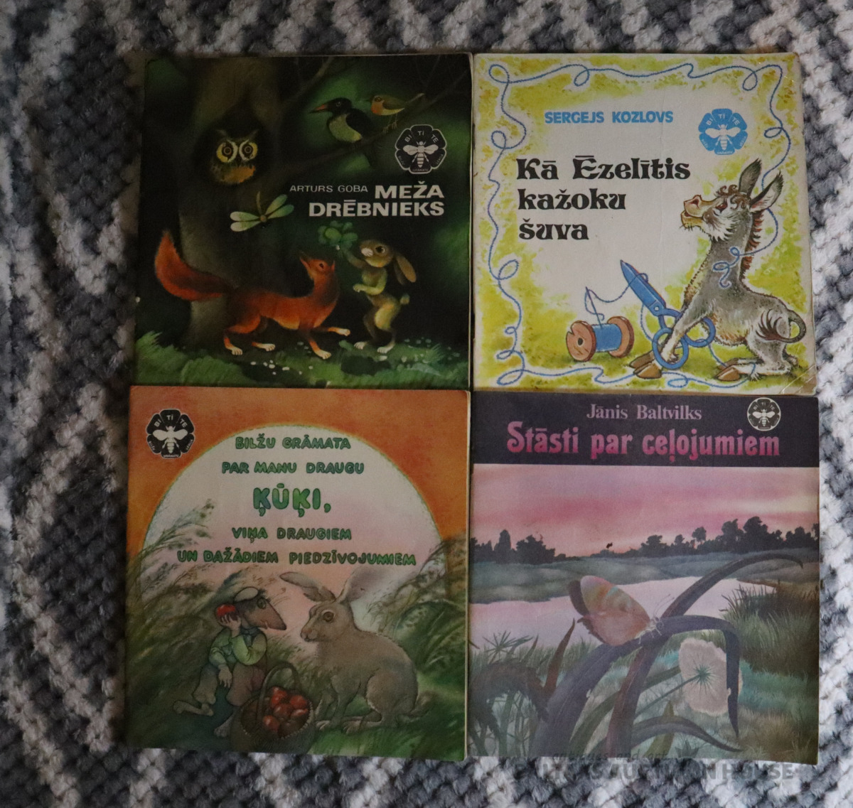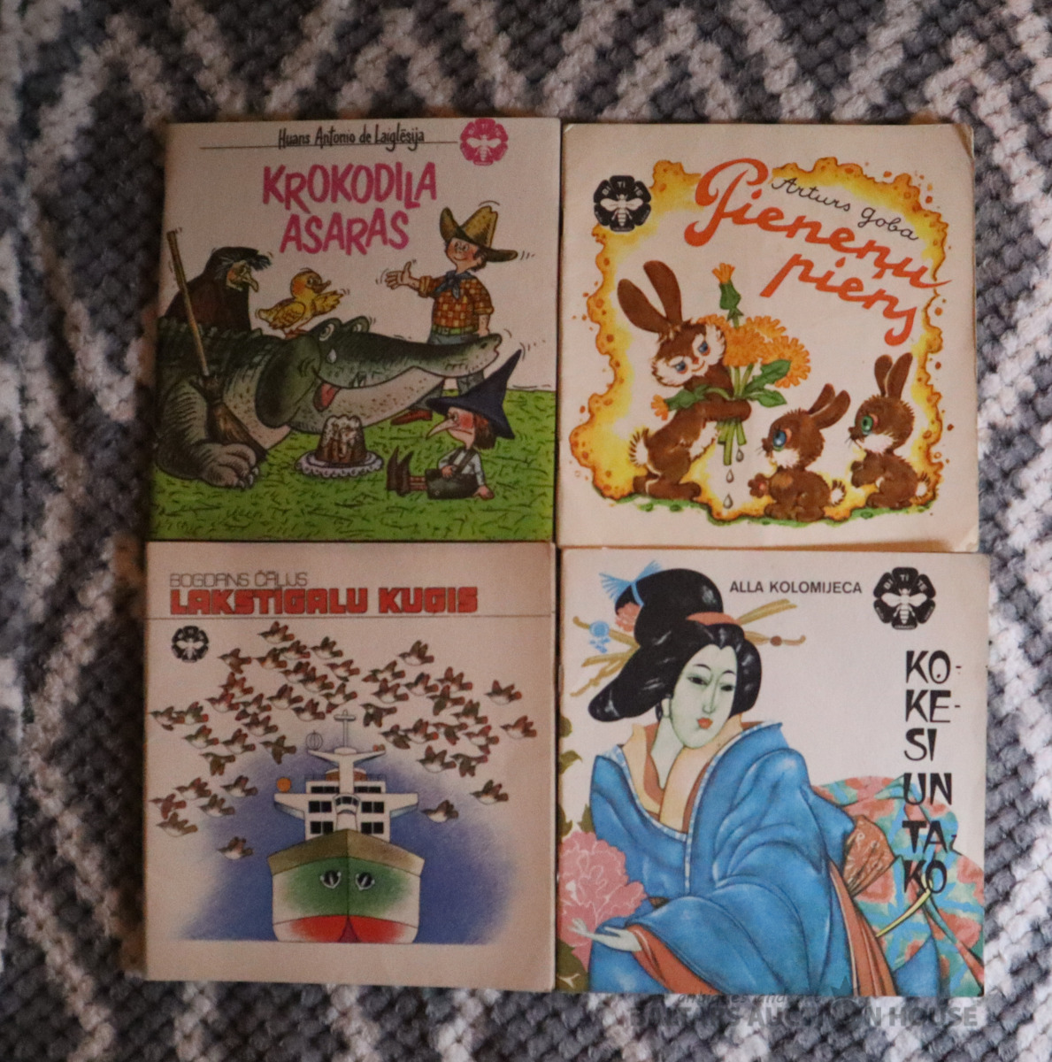 Četras bērnu grāmatas no sērijas "Bitīte". 1.Jānis Baltvilks "Stāsti par ceļojumiem" 1988.g. 2.Sergejs Kozlovs "Kā ēzelītis kažoku šuva" 1984.g. 3."Bilžu grāmata par manu draugu Ķūķi" 1983.g. 4.Artūrs Goba "Meža drēbnieki" 1976.g. (Sašvīkāts vāks no iekšpuses un titullapa ar lodīšu piltspalvu).