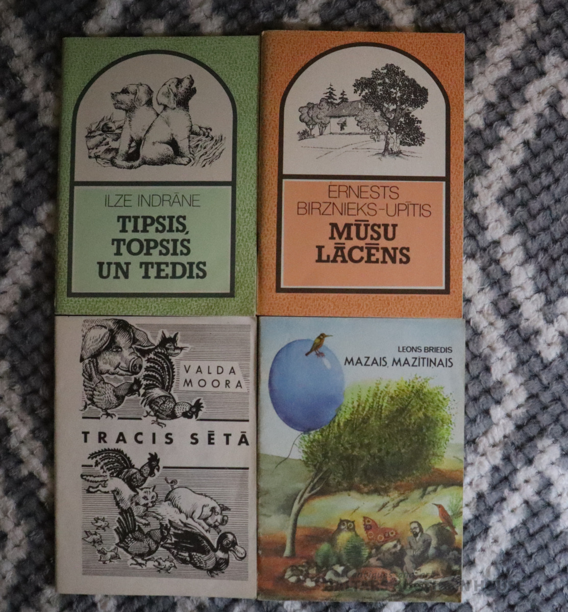 Četras bērnu grāmatas teicami saglabātas. 1.Valda Moora "Tracis sētā" 1992.g. 2.Leons Briedis "Mazais, Mazītiņais" 1986.g. 3.Ernests Birznieks-Upītis "Mūsu lācēns" 1990.g. (mākslinieki I.Zeberiņš, A.Kronenbergs, J.Jaunsudrabiņš) 1990.g. 4.Ilze Indrāne "Tipsis, Topsis un Tedis" 1990.g.
