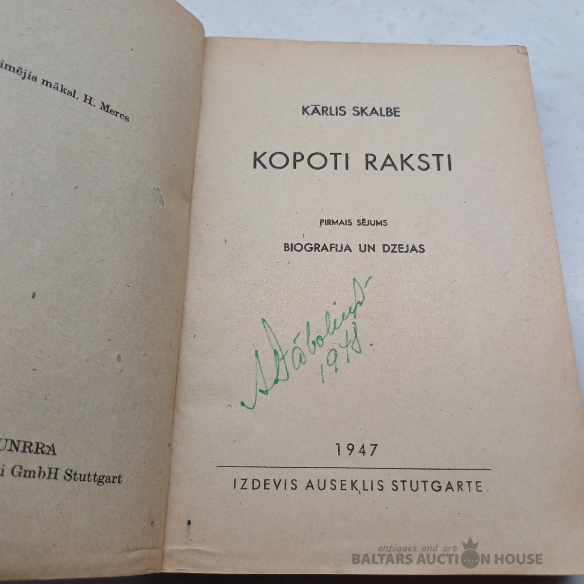 Kārlis Skalbe KOPOTI RAKSTI, 1947. g. Izdevis AUSEKLIS Štutgartē. Vāku zīm. H. Mercs