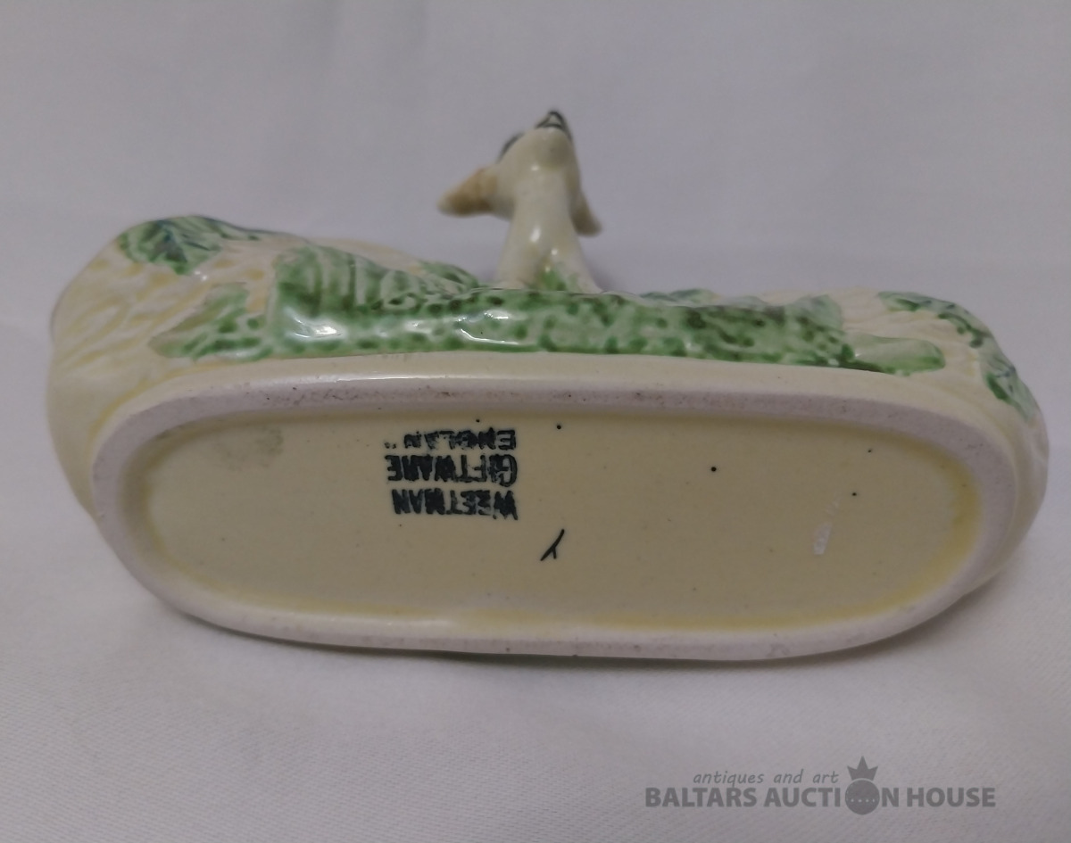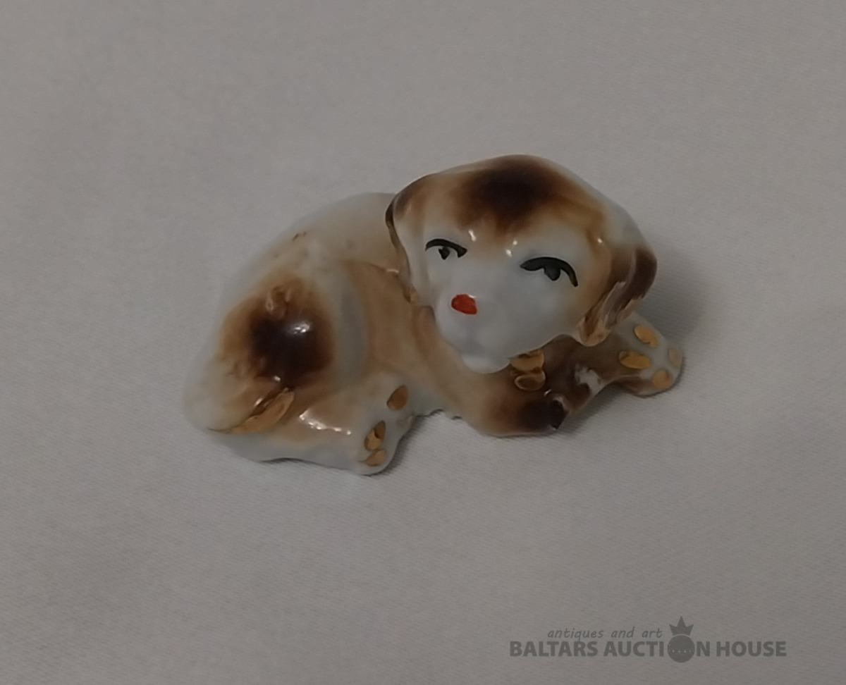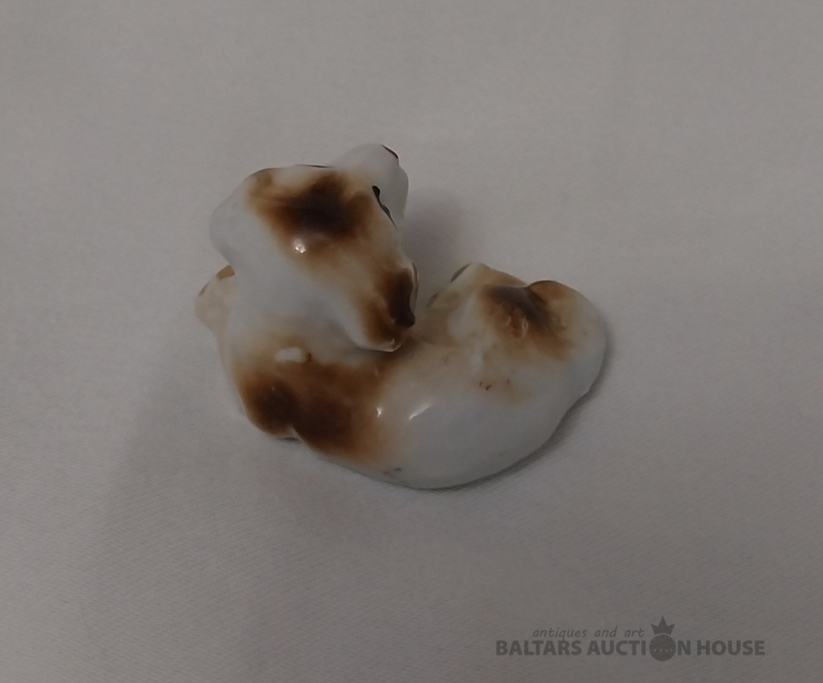 Porcelāna sunītis guļošā pozā. H 2.5 × 5 cm Grupas bildej informatīva nozīme.