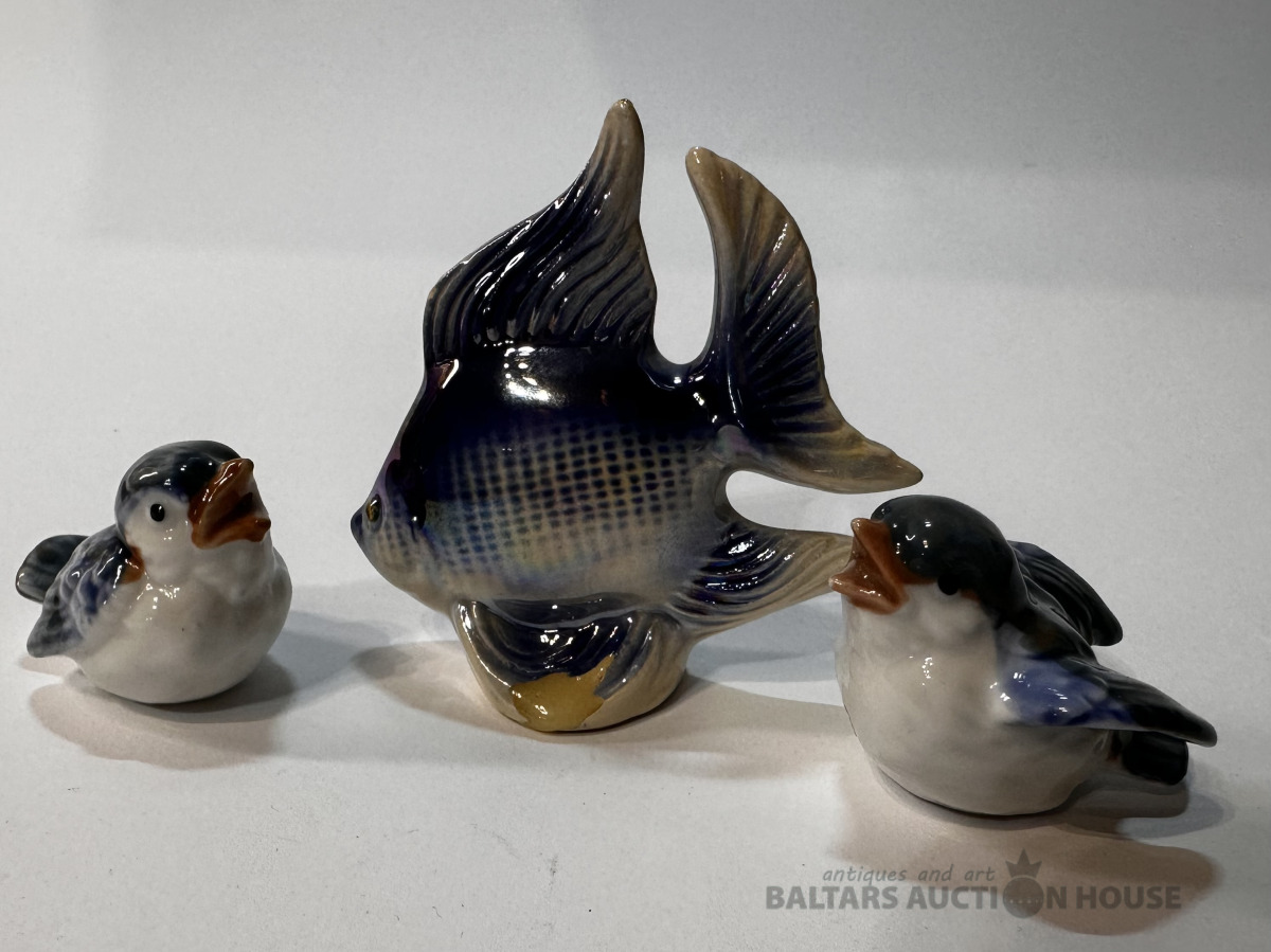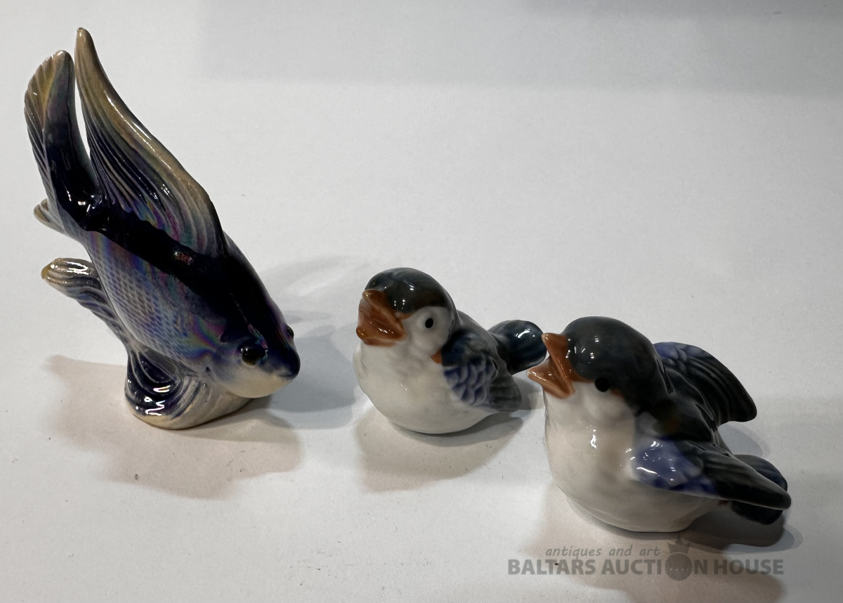 Porcelāna figūriņas, 3 gb, bez zīmogiem, lielums putniem 3,5 cm, zivs augstums 7 cm. Putni ideālā kondīcijā, zivs remontēta.