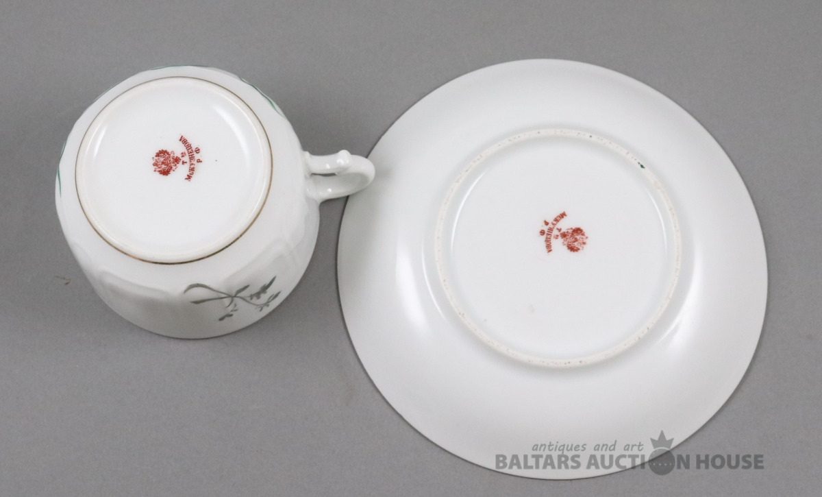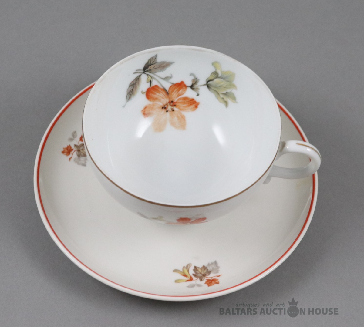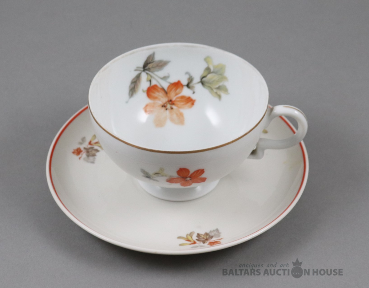 Tase ar apakštasi. Porcelāns, Kuzņecova fab., roku gleznojums. h=7,6 cm. d=8 cm un 15,4 cm