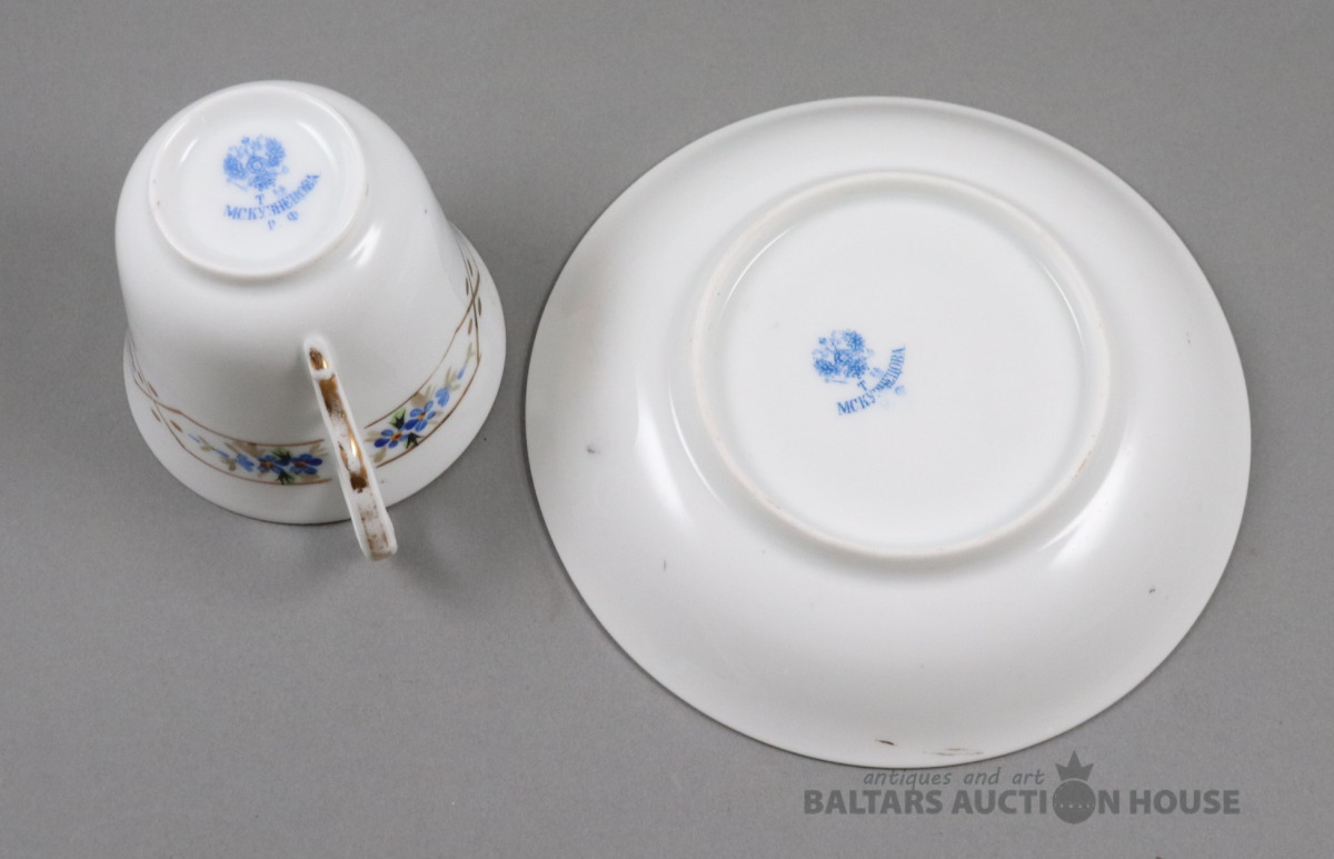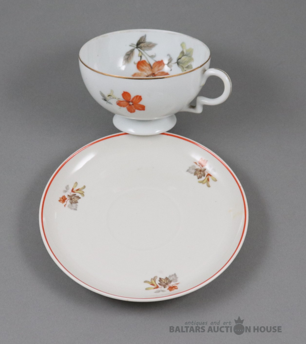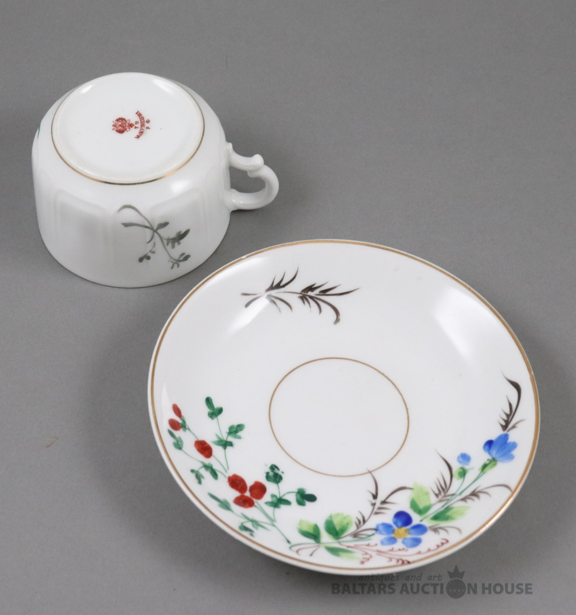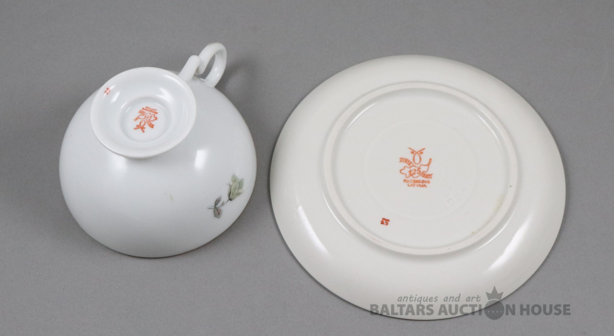 Tase ar apakštasi. Porcelāns, Kuzņecova fab., roku gleznojums. h=5,4 cm. d=7,7 cm un 13,6 cm