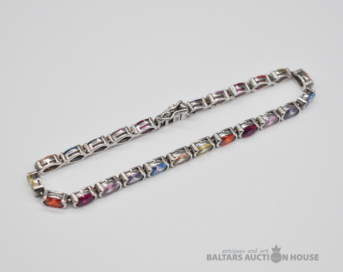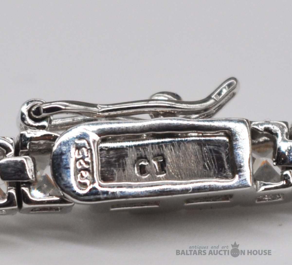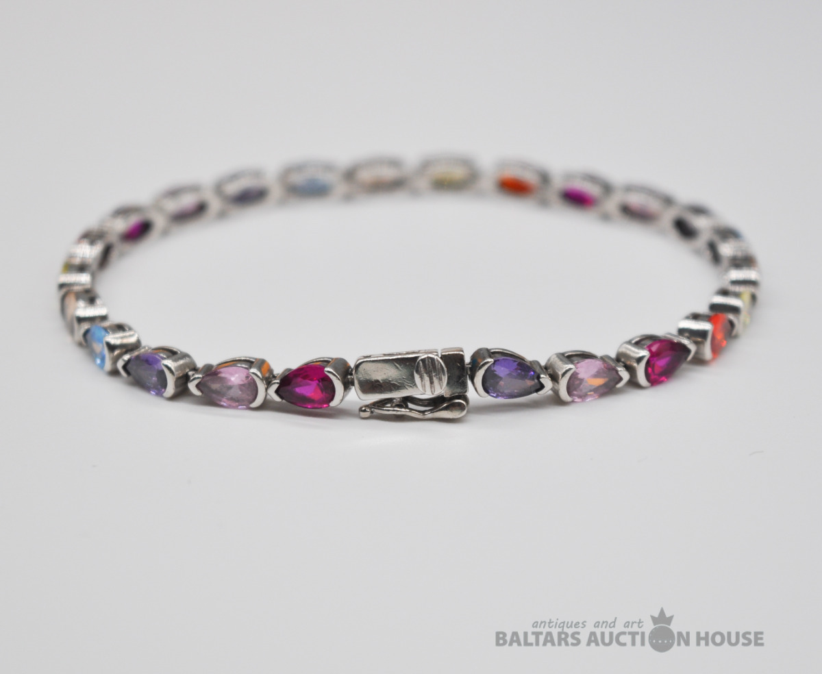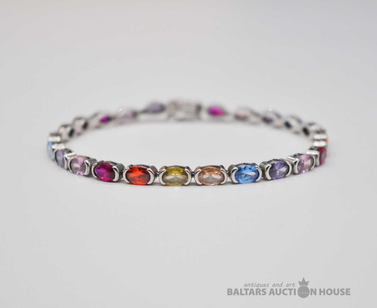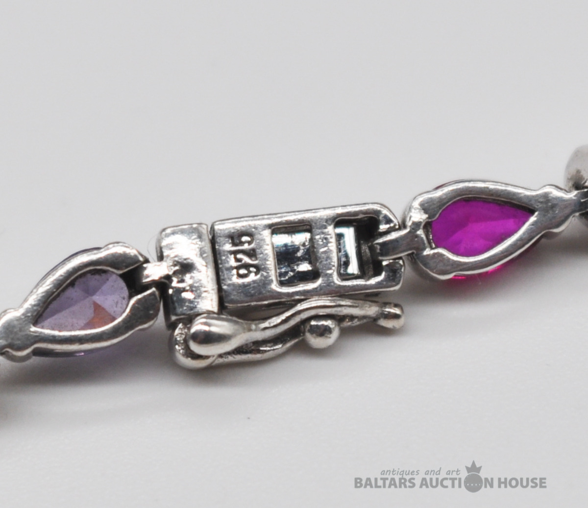 Skaista sudraba aproce ar krāsainiem cirkonijiem. Garums 18.5 cm. Platums 4 mm. Svars 10.7 grami. Серебряный браслет с цветным цирконием. Длина 18.5 см. Ширина 4 мм. Вес 10.7 грамм.