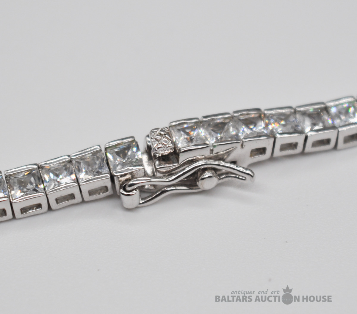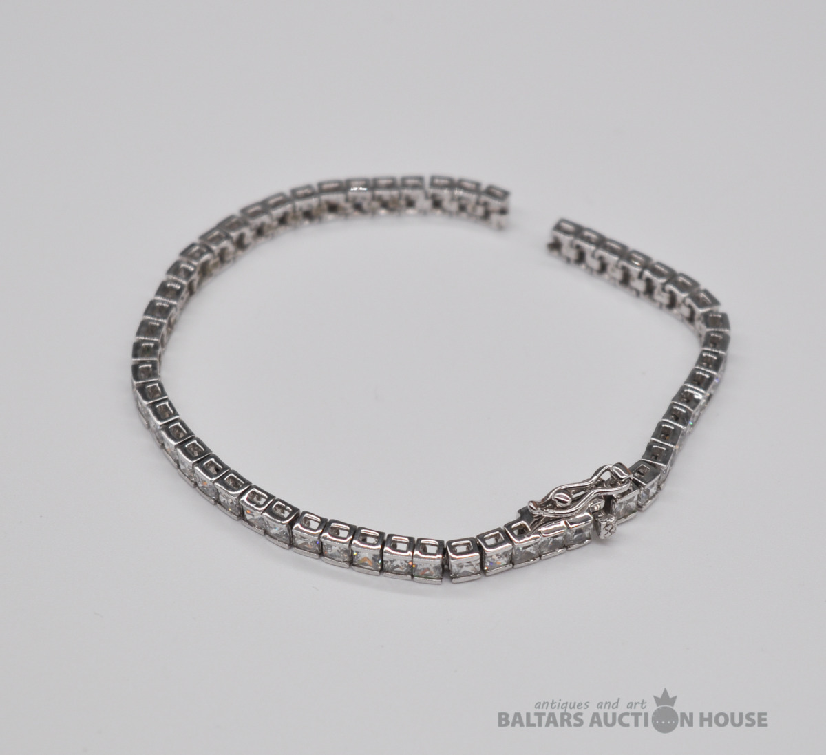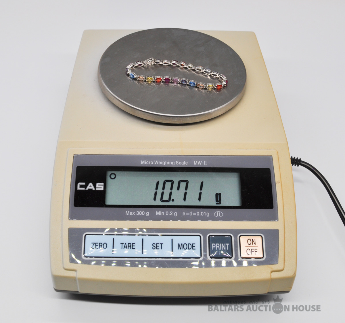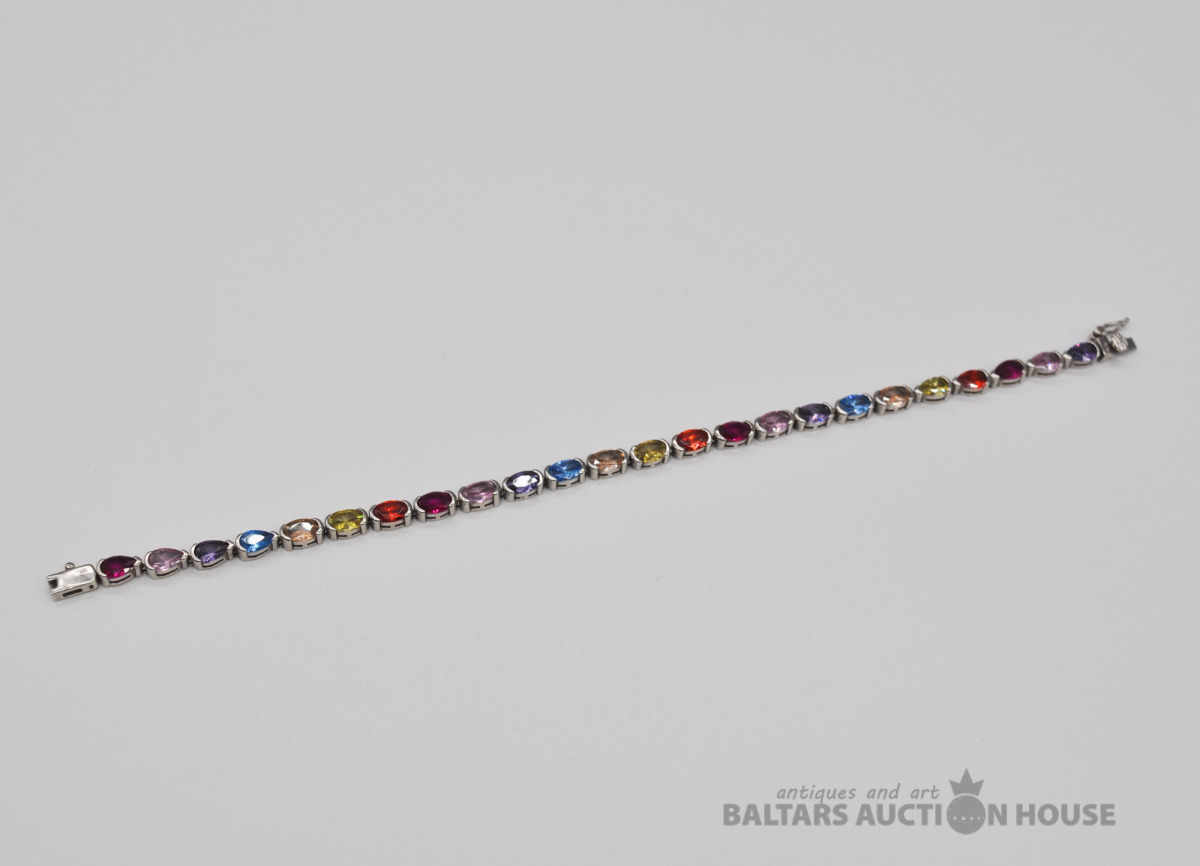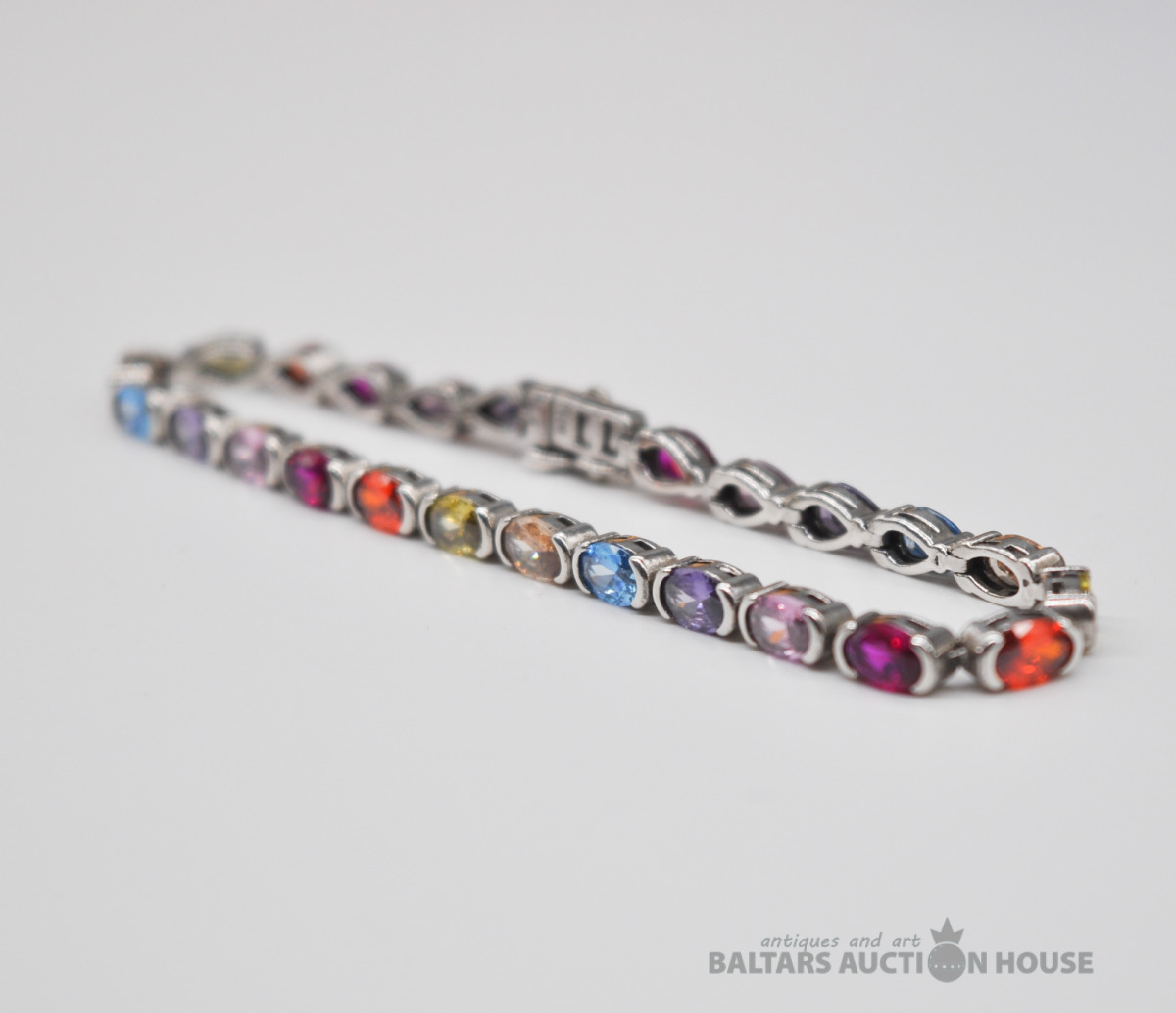 Skaista sudraba aproce ar krāsainiem cirkonijiem. Garums 18.5 cm. Platums 4 mm. Svars 10.7 grami. Серебряный браслет с цветным цирконием. Длина 18.5 см. Ширина 4 мм. Вес 10.7 грамм.