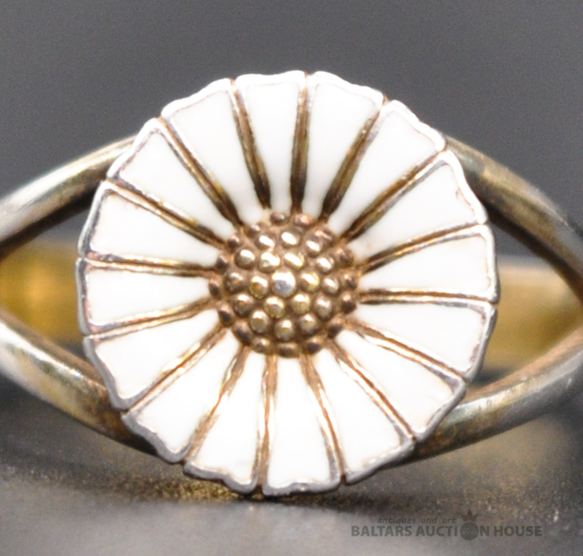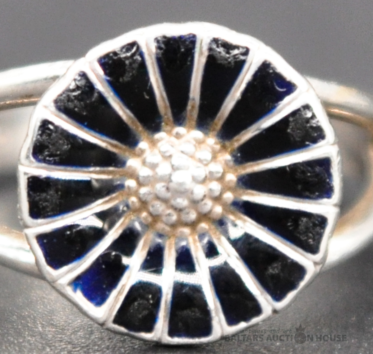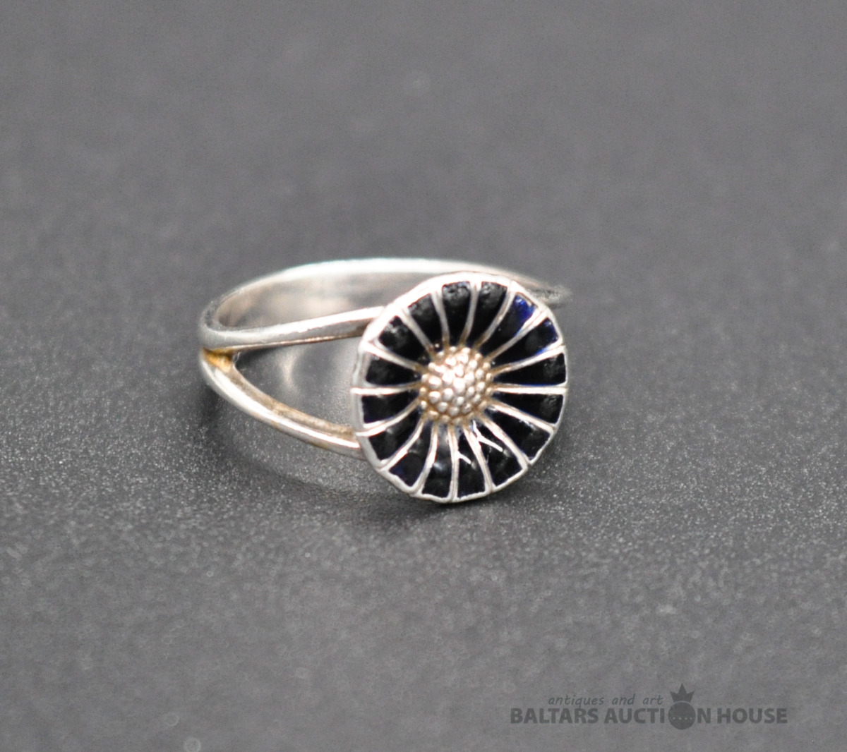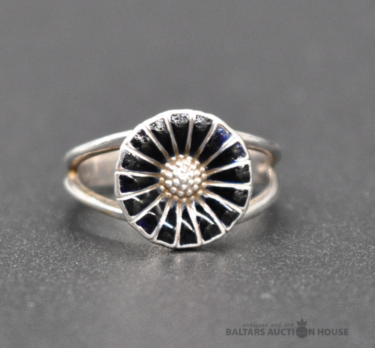 Klasisks GEORG JENSEN "Margrietiņa" gredzens. Sudrabs/Melna emalja. (Emaljas nolietojums) Izmērs 15.5 mm. Svars 2.6 grami. Классическое кольцо Ромашка от легендарного производителя GEORG JENSEN. Серебро/Черная эмаль. (Эмаль со следами активного ношения) Размер 15.5 мм. Вес 2.6 грамма.