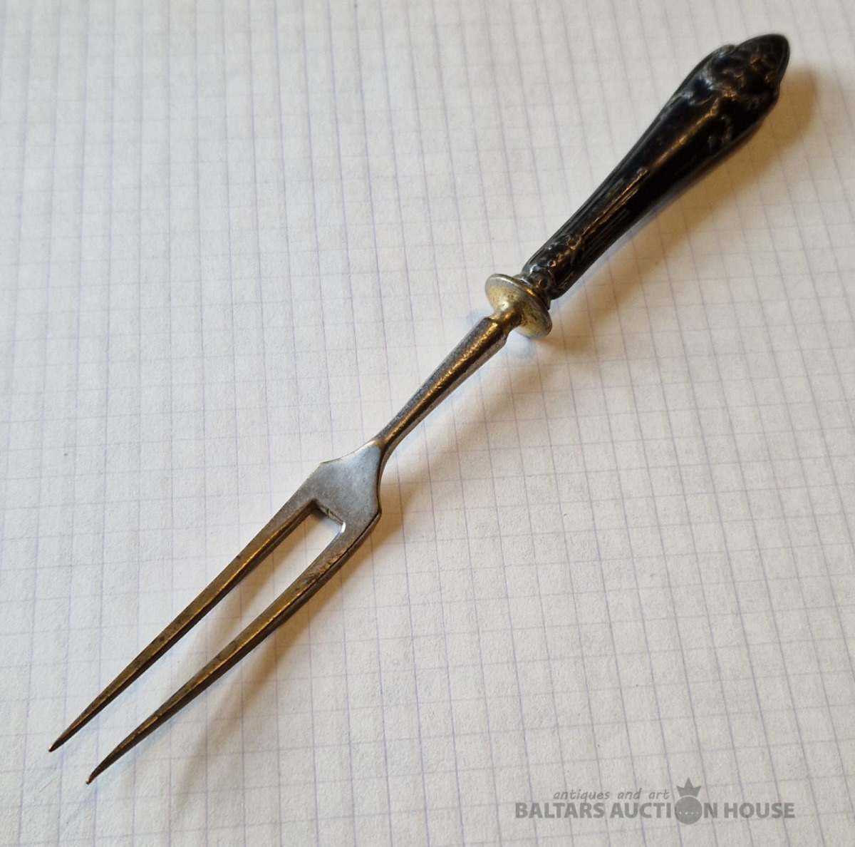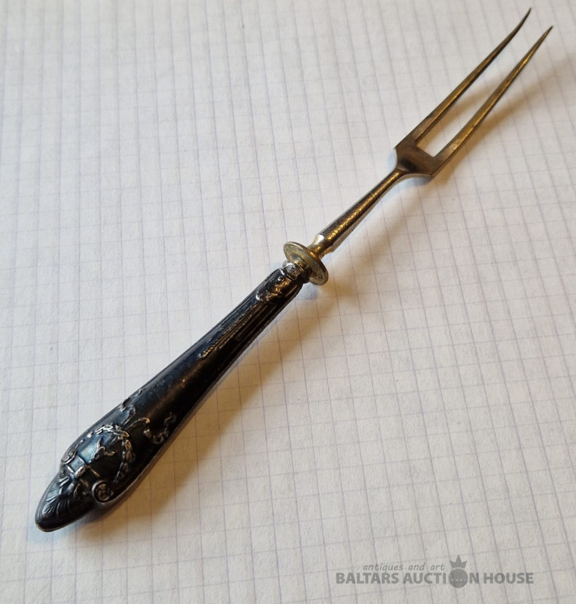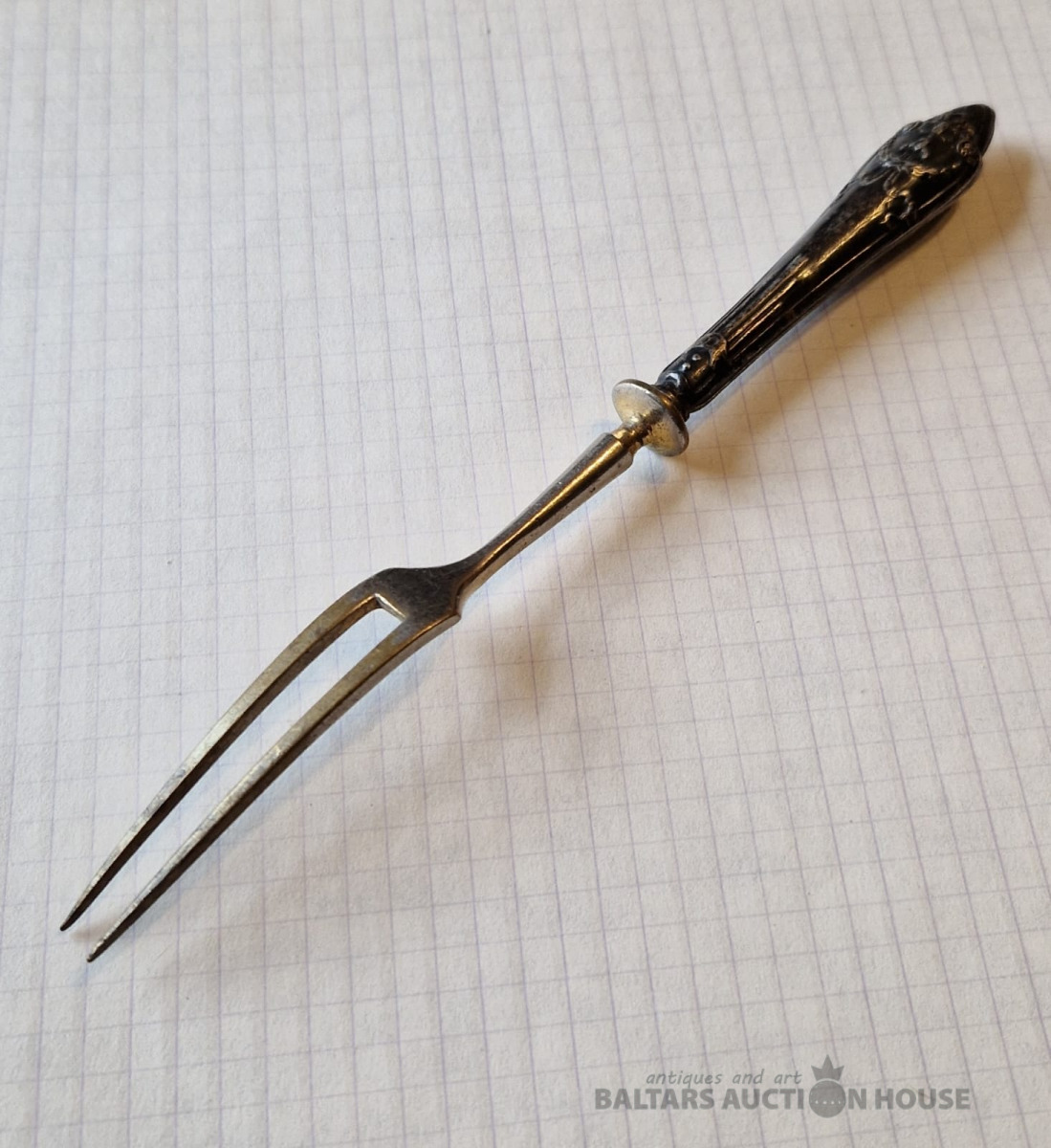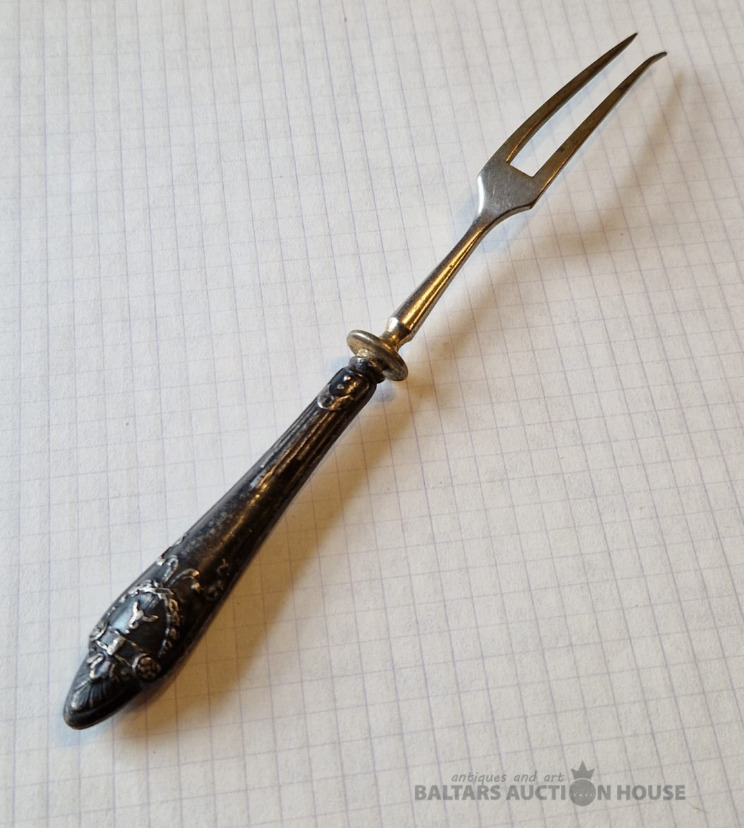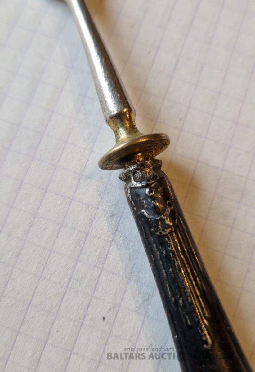 Pirmskara Latvijas dakšiņa ar sudraba apdari . 875 prove , zeltījuma zudums . L - 17,7 cm , kopējais svars - 27 gr