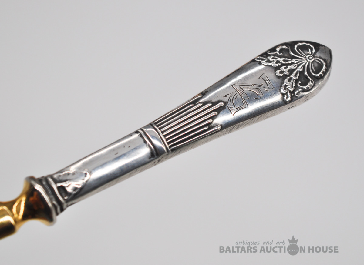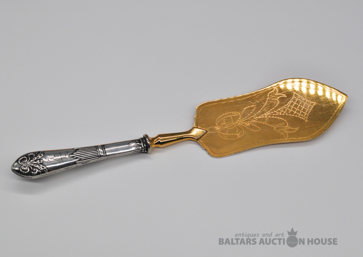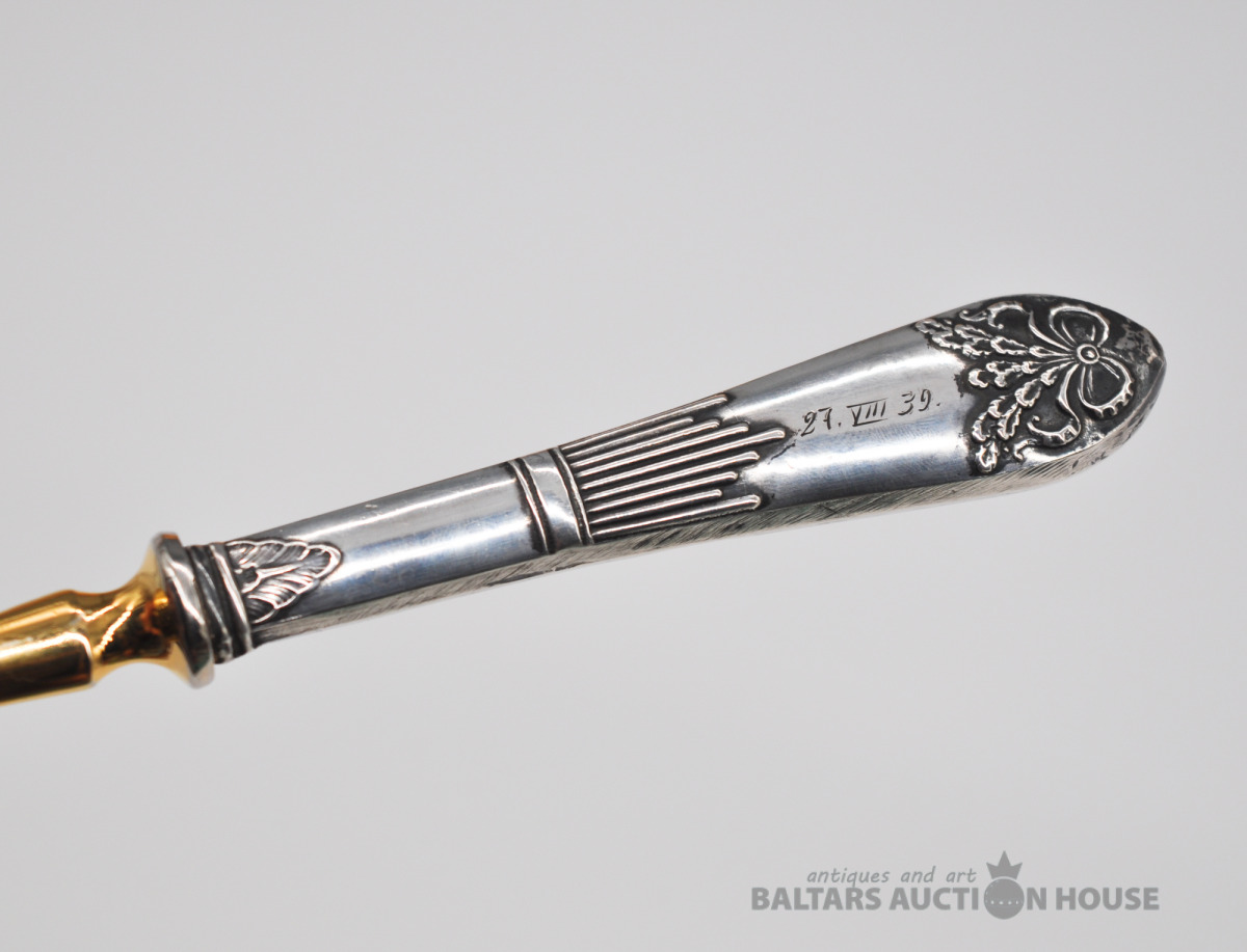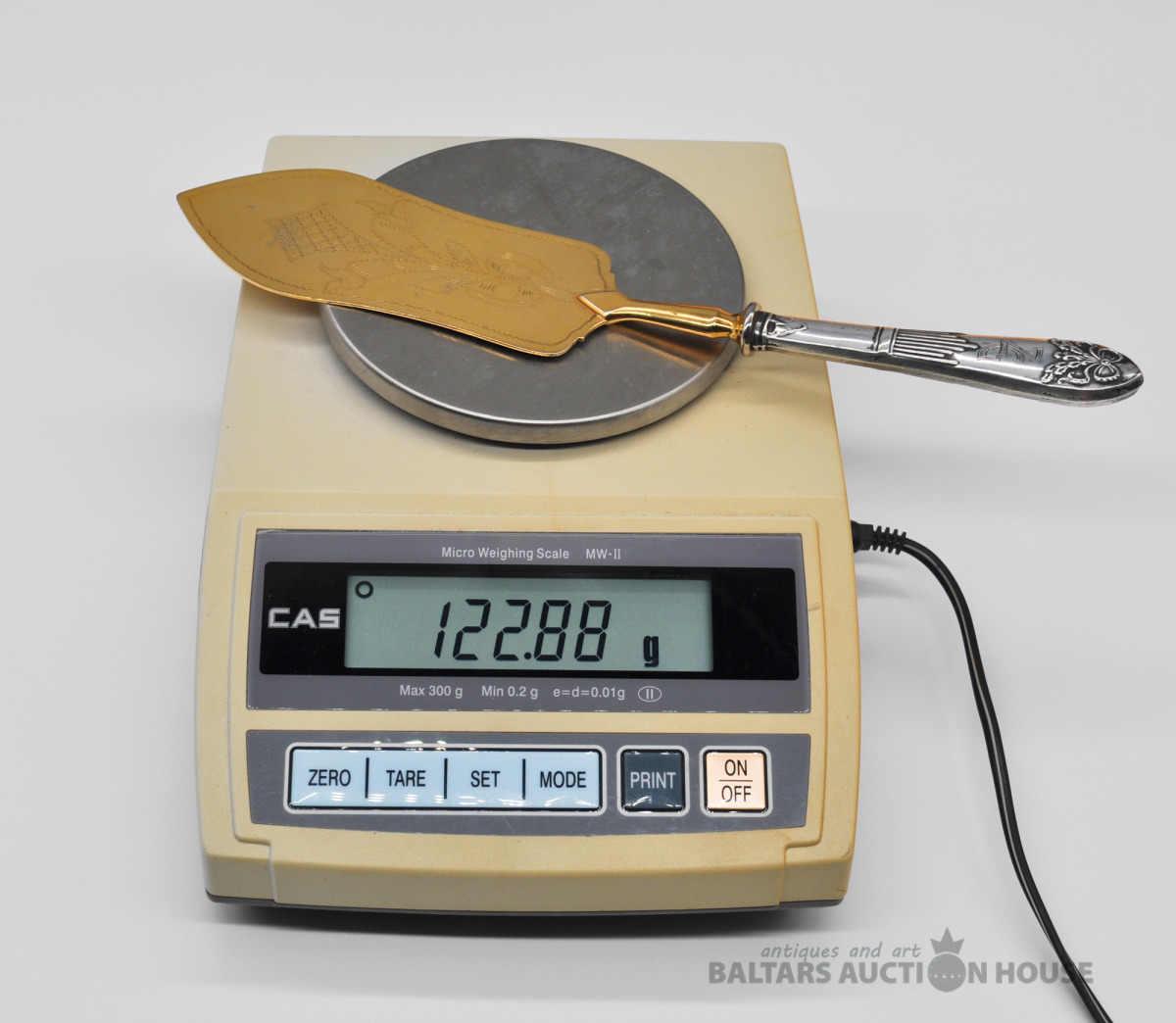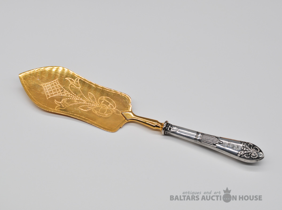 Tortes lāpstiņa ar 875 sudraba rokturi. Latvija. Labi saglabājies zeltījums. Garums 29 cm. Svars 122.8 grami. Лопатка для торта с серебряной (875) ручкой. Довоенная Латвия. Длина 29 см. Вес 122.8 грамм.