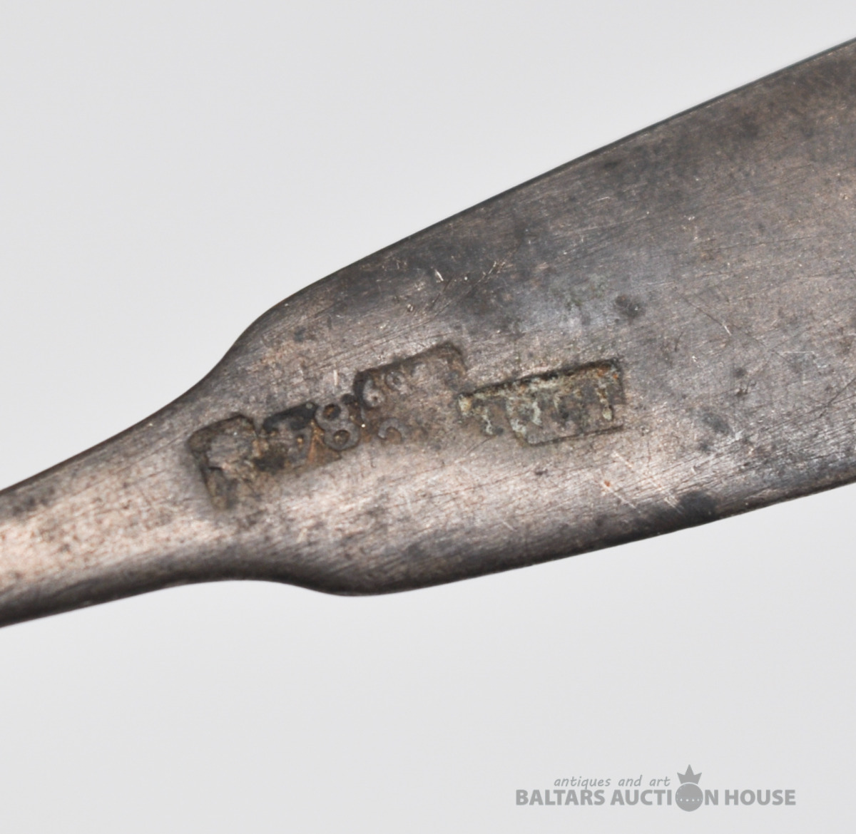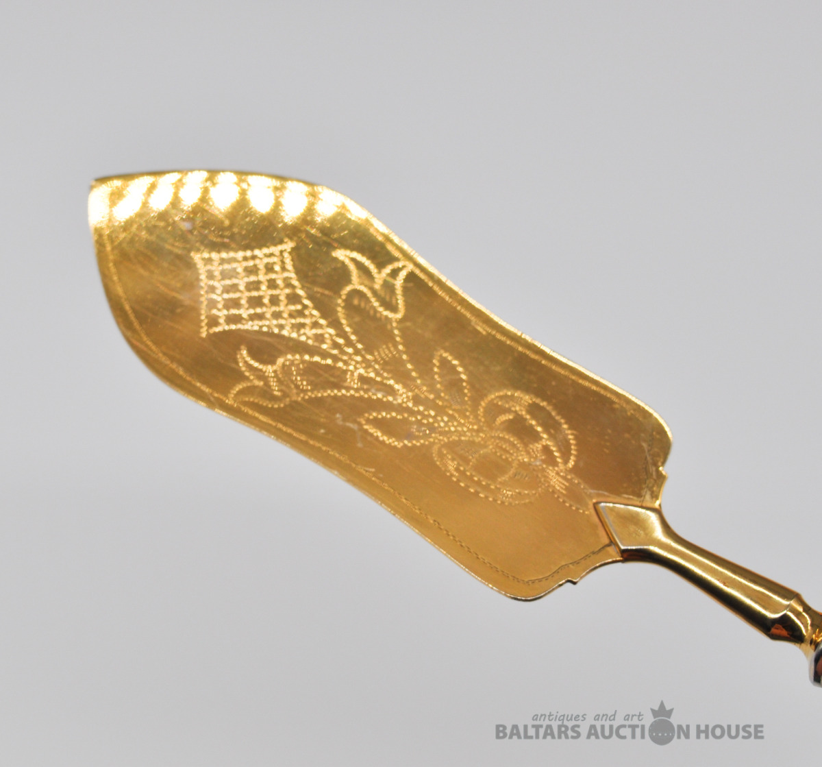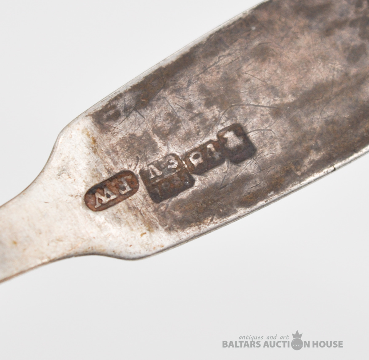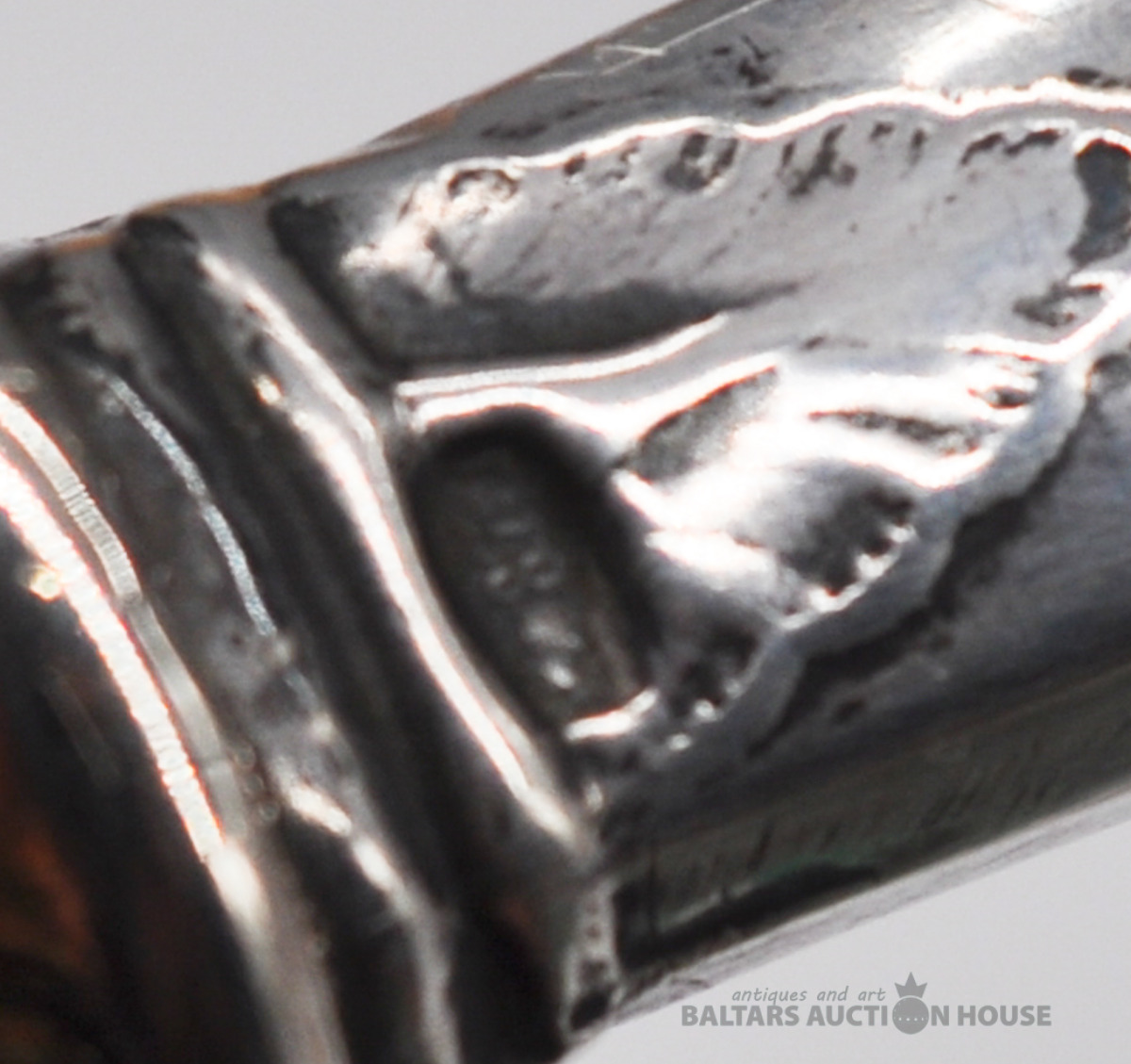 Tortes lāpstiņa ar 875 sudraba rokturi. Latvija. Labi saglabājies zeltījums. Garums 29 cm. Svars 122.8 grami. Лопатка для торта с серебряной (875) ручкой. Довоенная Латвия. Длина 29 см. Вес 122.8 грамм.