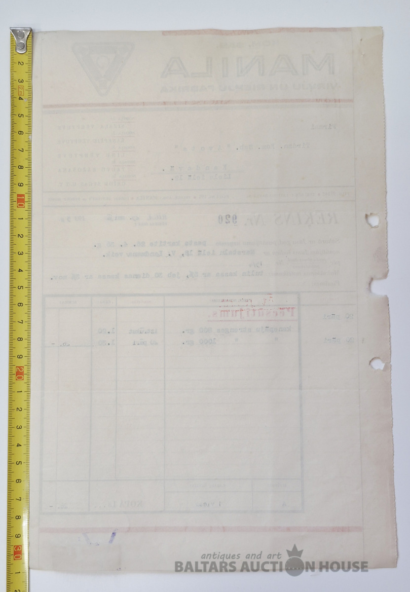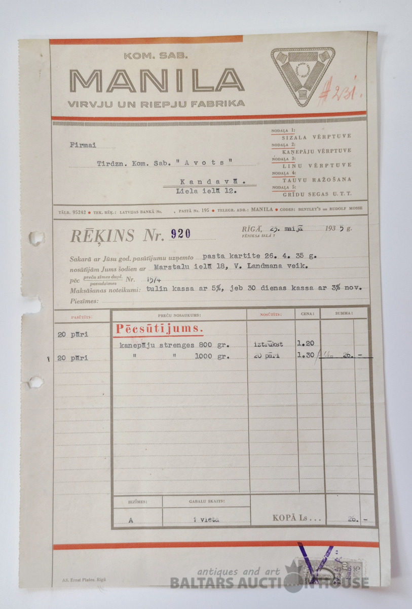Rēķins. Kom.sab. MANILA, Virvju un riepju fabrika, 1935g.